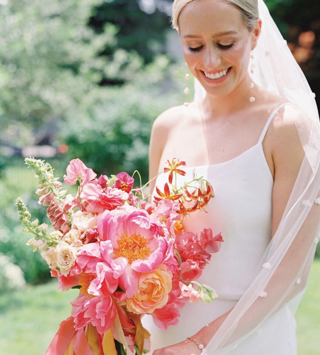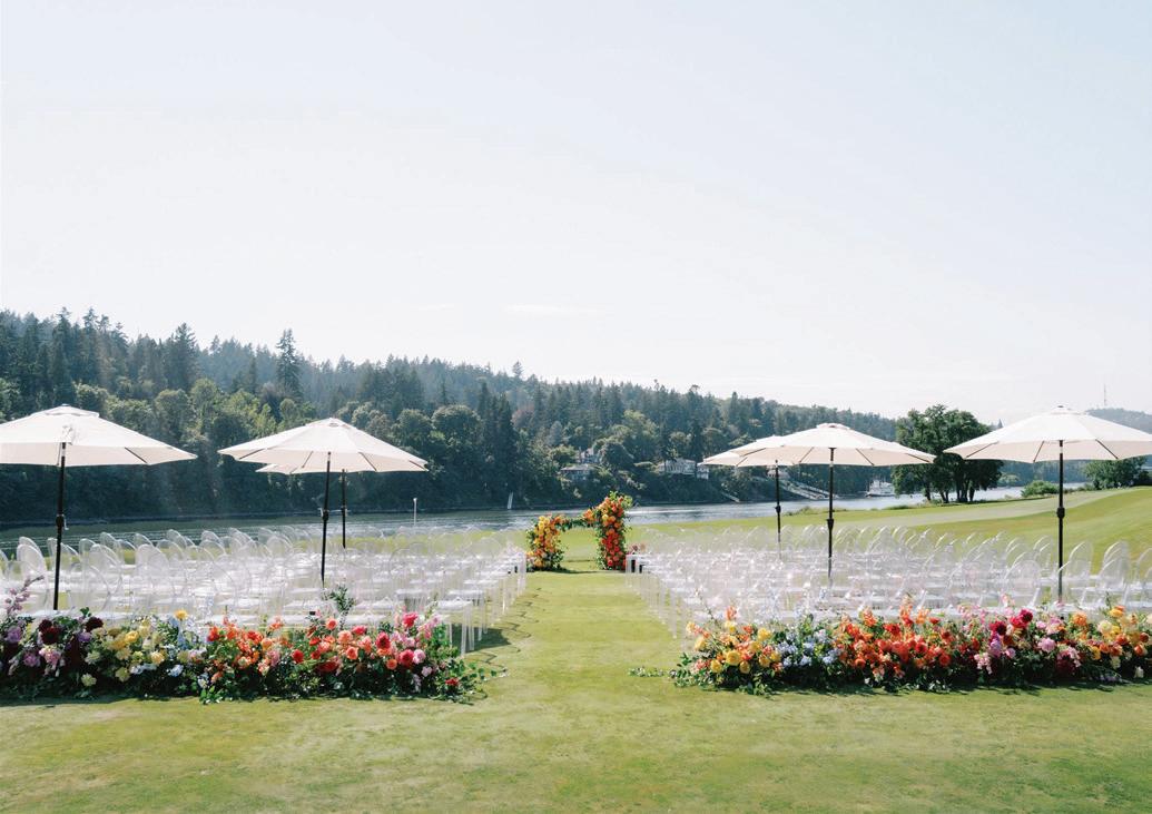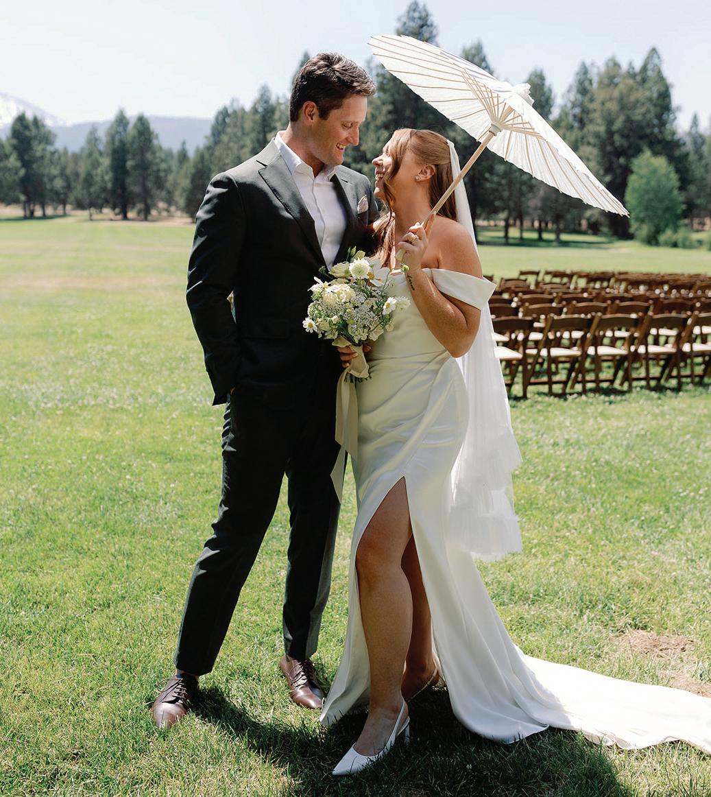 Whitney and Mitchell enjoy boating on the Willamette River in the summer months, so they knew that Waverley Country Club would be a perfect spot for their dream wedding amid blue skies, 360-degree views and boats cruising the river in the background. Their celebration was full of thoughtful details and touches from start to finish. Throughout their relationship, Mitchell has always surprised Whitney with flowers. To recall a similar feeling, Mitchell handed Whitney her bouquet during their first look on their wedding day—a sentimental, sweet moment. The groom even had a “first look” with his mom and sisters. Whitney described her floral vision as “wildflowers that met elegance,” which bounded in bright colors and textures against the verdure of the property. Wildflowers continued to a stunning cake meadow holding a classic all-white confection from Papa Haydn, a place the family would always buy special occasion cakes. When it came to the reception, the couple sought to create an unforgettable alfresco dining moment for their guests that captured the slow, easy pace of summer when you’re surrounded by loved ones with nowhere else to be. Looking back on the day, Whitney wouldn’t change a thing: “There really is no moment like walking down the aisle to marry the love of your life,” she says. “Let yourself truly be all in at that moment! You will realize nothing in the world matters other than all the love between the two of you and the support of your friends and family for your lifetime together. We would redo this day, in the same way, in a heartbeat.” —Chelsea Gibson