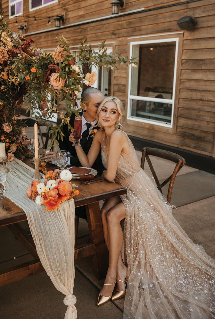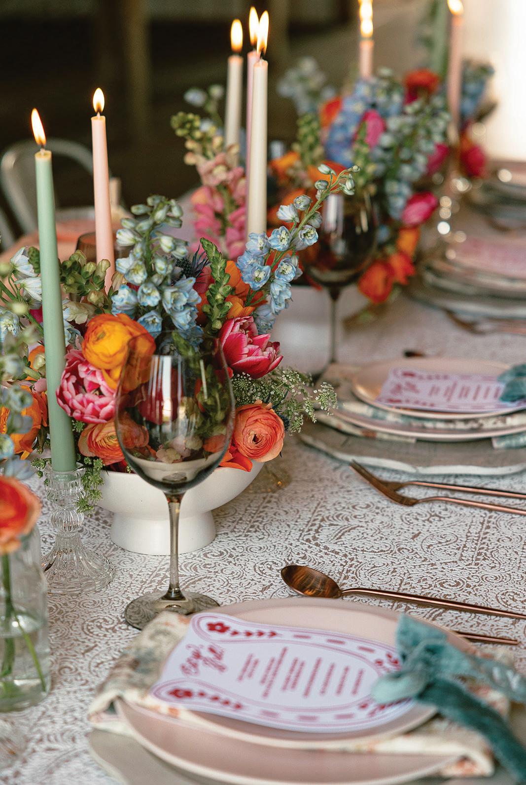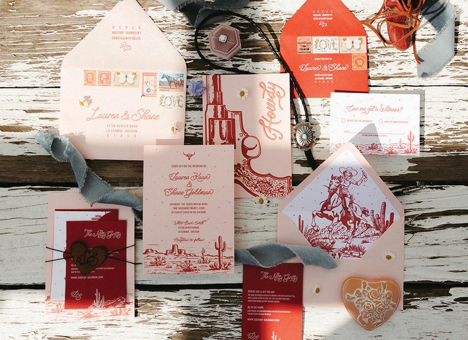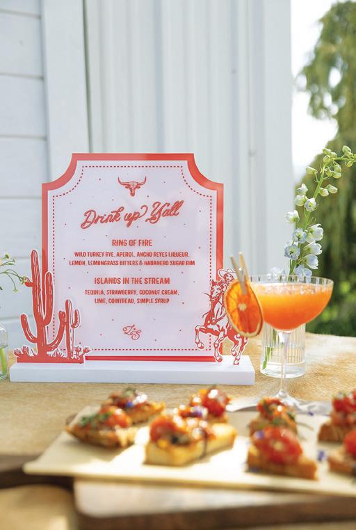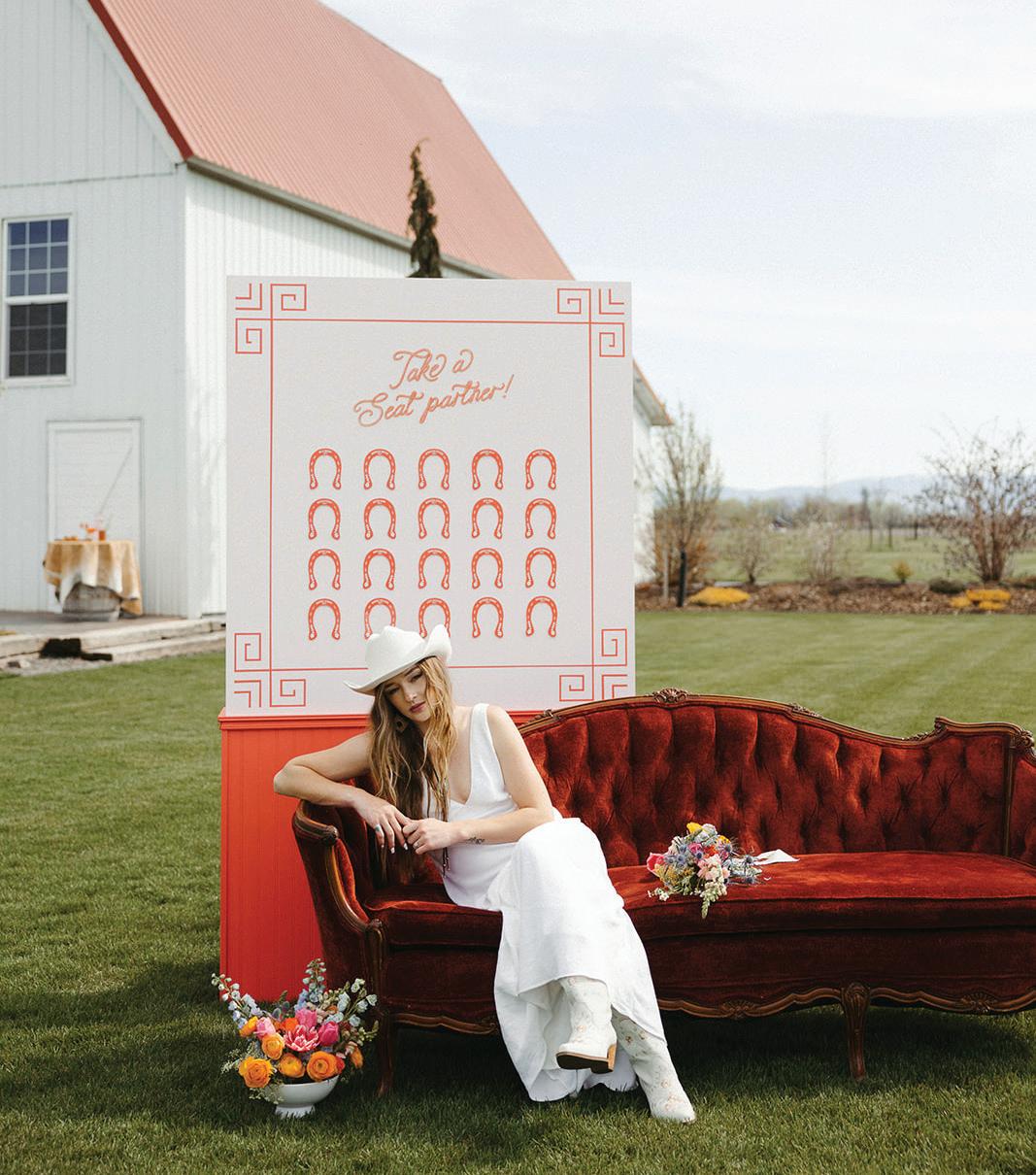From fashion to design and home décor, Western is trending in a big way—and was the very vision for Andrea Lilly of House of Lilly Events when planning and executing a beautiful editorial at The White Barn Estate in La Grande. In addition to popular icons like Dolly Parton, Johnny Cash and John Denver, Lilly took cues from someone close to her heart: “The inspiration came from my fashionable grandmother, who was a cowgirl and loved her bright red lipstick, her cowgirl hats and large belt buckles,” she says. And while Western can sometimes feel kitschy or overdone, Lilly sought to bring an elevated aesthetic to the scheme. “This photoshoot was designed to be as vibrant and colorful as possible, showcasing that a Western-inspired wedding can be elegant and dynamic without the need for traditional elements like burlap or pampas grass,” she notes.