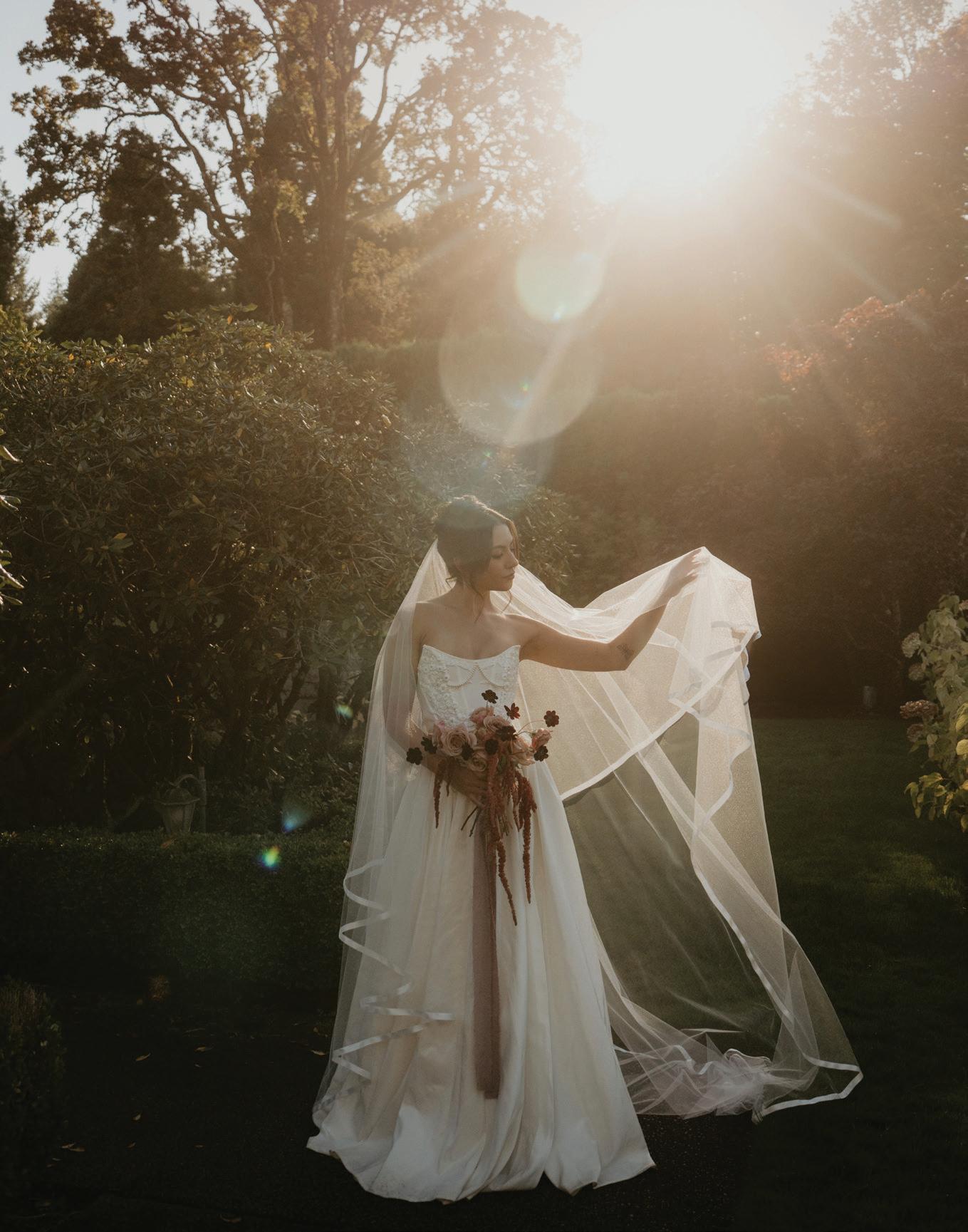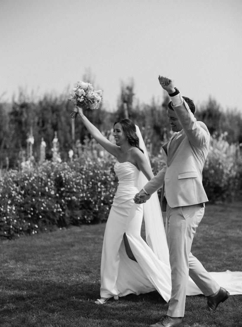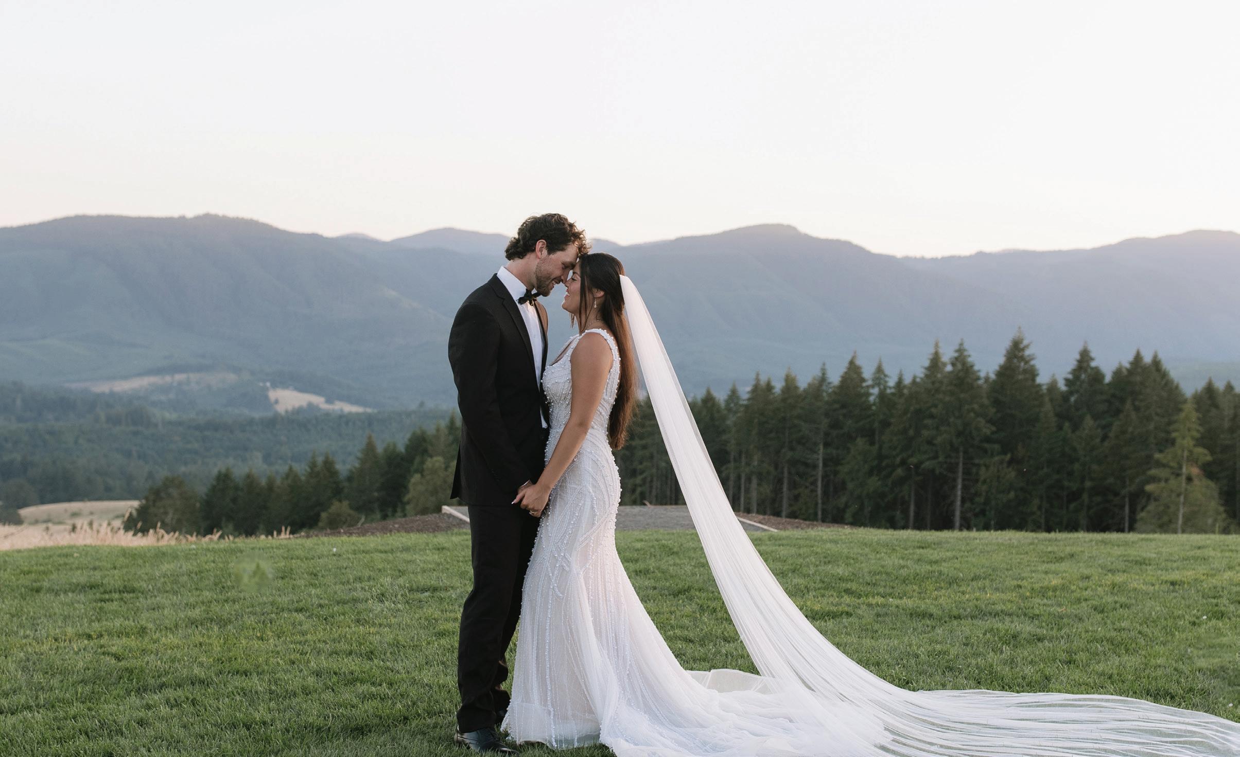 Kelsie Calderon and Hunter Strader were positively enveloped in love at their al fresco “I do’s” set against a bounty of florals and verdure. The bride and groom, connoisseurs of genuine love and grounded connections, celebrated their nuptials at The Orchard in Hood River among 150 friends and family members. When designing their day, they kept the natural beauty of the backdrop in mind, shooting for earthy and intimate details. An open ceremony space dotted with dahlias—Kelsie’s favorite—welcomed guests to the heartfelt vow exchange. Once the two were officially wed, attendees retreated to the indoor-outdoor reception space—some stopping at the lavender fields along the way to take pictures. Everyone dined under crisscrossing café lights at long farm tables sporting tulle runners and delicate posies of blush, coral and cream blooms, nodding to the sprawling gardens and orchard on the property. After performing their first dance on the lawn, the newlyweds joined the party at their sweetheart table, which sat behind a grand arrangement of the day’s signature blossoms. Following a delicious dinner, warm speeches from their nearest and dearest highlighted the couple’s all-encompassing love, bringing both tears and laughter to the room. Hunter and Kelsie danced away in their elegant ensembles: Hunter in a tan-suit-white-tie combination and Kelsie in a sleek, form-fitting sweetheart gown. The pair made it a point to hold special dances not only with their parents but with their grandparents as well. The following dance party was only paused when the couple cut their cake— the icing on top of an idyllic wedding day. —Megan Simpson Teeter