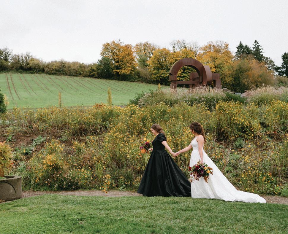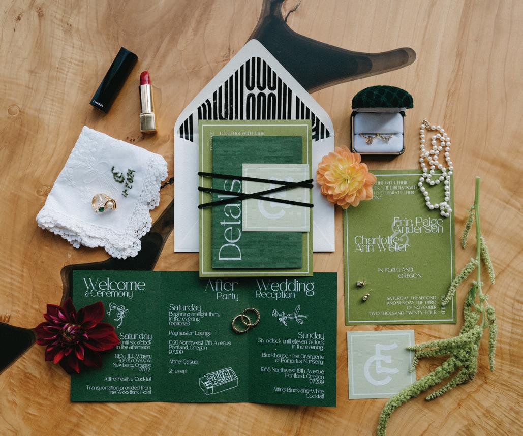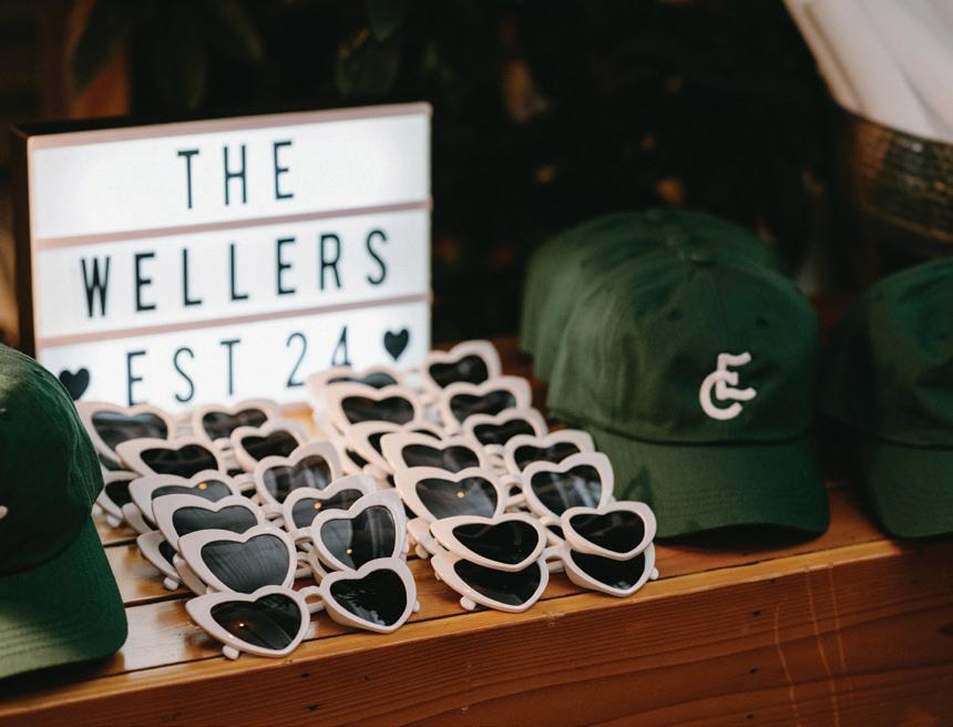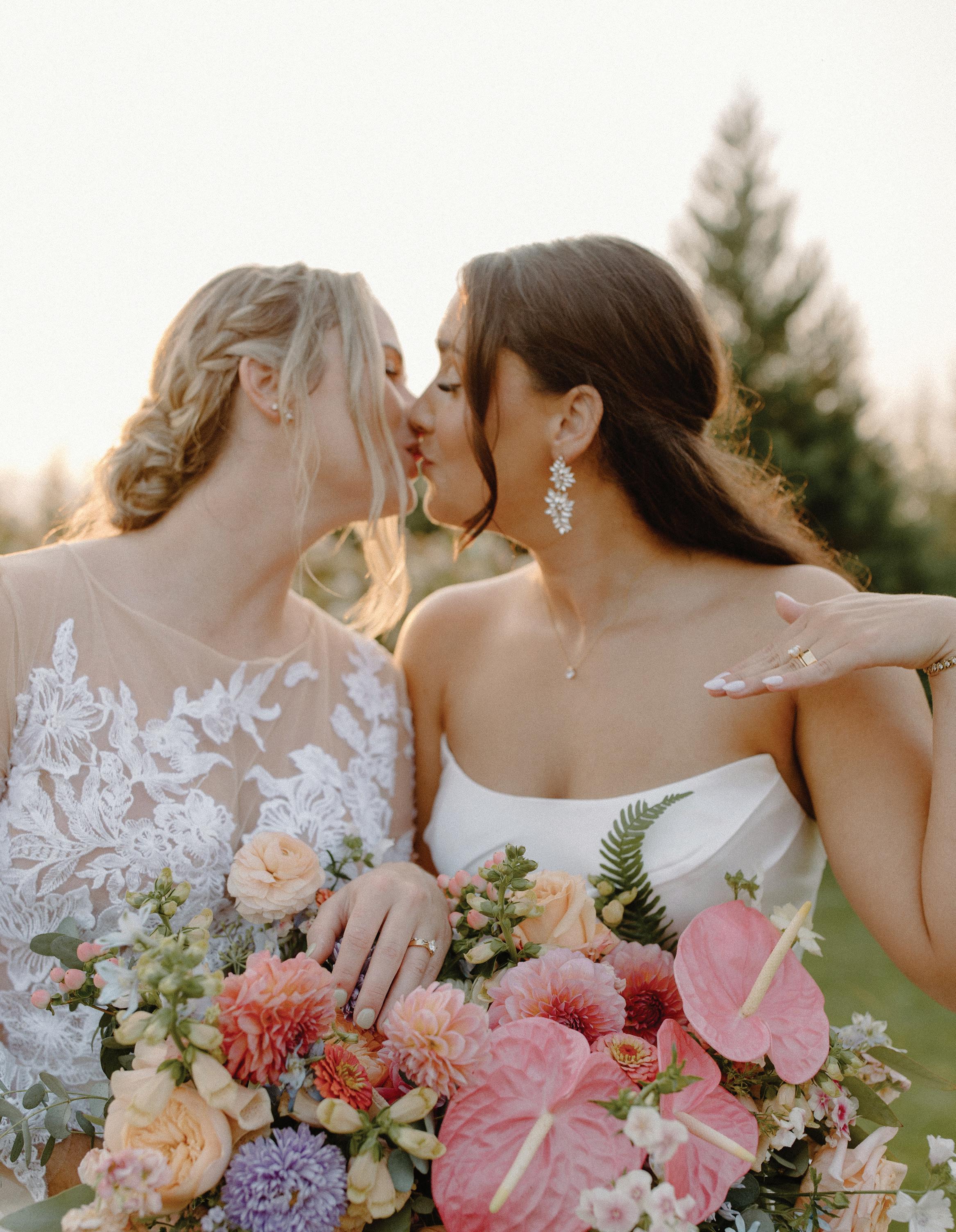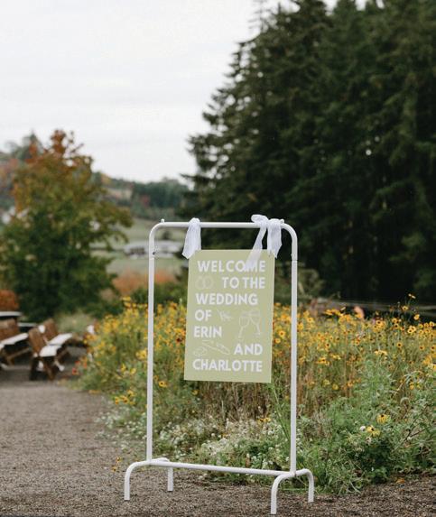 Erin Anderson and Charlotte Weller’s wedding weekend perfectly reflected the duality of the couple’s interests with a warm, intimate ceremony followed by a lively dinner and dance party. The happy couple wanted to honor both their love for the outdoors and their passion for exploring city life with a two-day excursion, each day inspired by their complementary hobbies. Under an overcast sky, Charlotte and Erin’s vision for a cozy ceremony came to life on the verdant grounds of Rex Hill Winery. Erin and Charlotte opted for unique textures and color combinations when it came to their floral arrangements. Romantic blooming dahlias, roses and zinnias were paired with playful ornamental kale, amaranth and smoke bush in colorblocked hues of burgundy, bright pink and creamsicle orange. Charlotte’s black satin puff-sleeved gown contrasted beautifully against Erin’s whimsical floral lace, a visual representation of their dynamic personalities. Their tear-jerking ceremony, framed by moody florals, was followed by a simple cocktail hour, during which guests reveled in the newlyweds’ love. The following day, elegant signage stated, “Join us at the Love Club,” inviting Charlotte and Erin’s loved ones for an evening of dinner, drinks and dancing. Soft shades of sage served as an accent, gracing the tablescape and custom matchboxes. Embroidered hats, heart-shaped sunnies and light-up foam sticks were offered as accessories for the dance floor. After a lively dinner and dancing, Erin and Charlotte gifted their guests with custom cookies showcasing their beloved pet as a sweet ending to their day. —Ryley S. Hoff