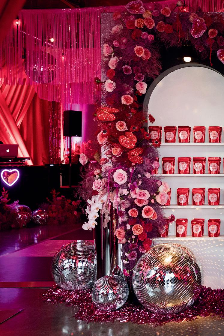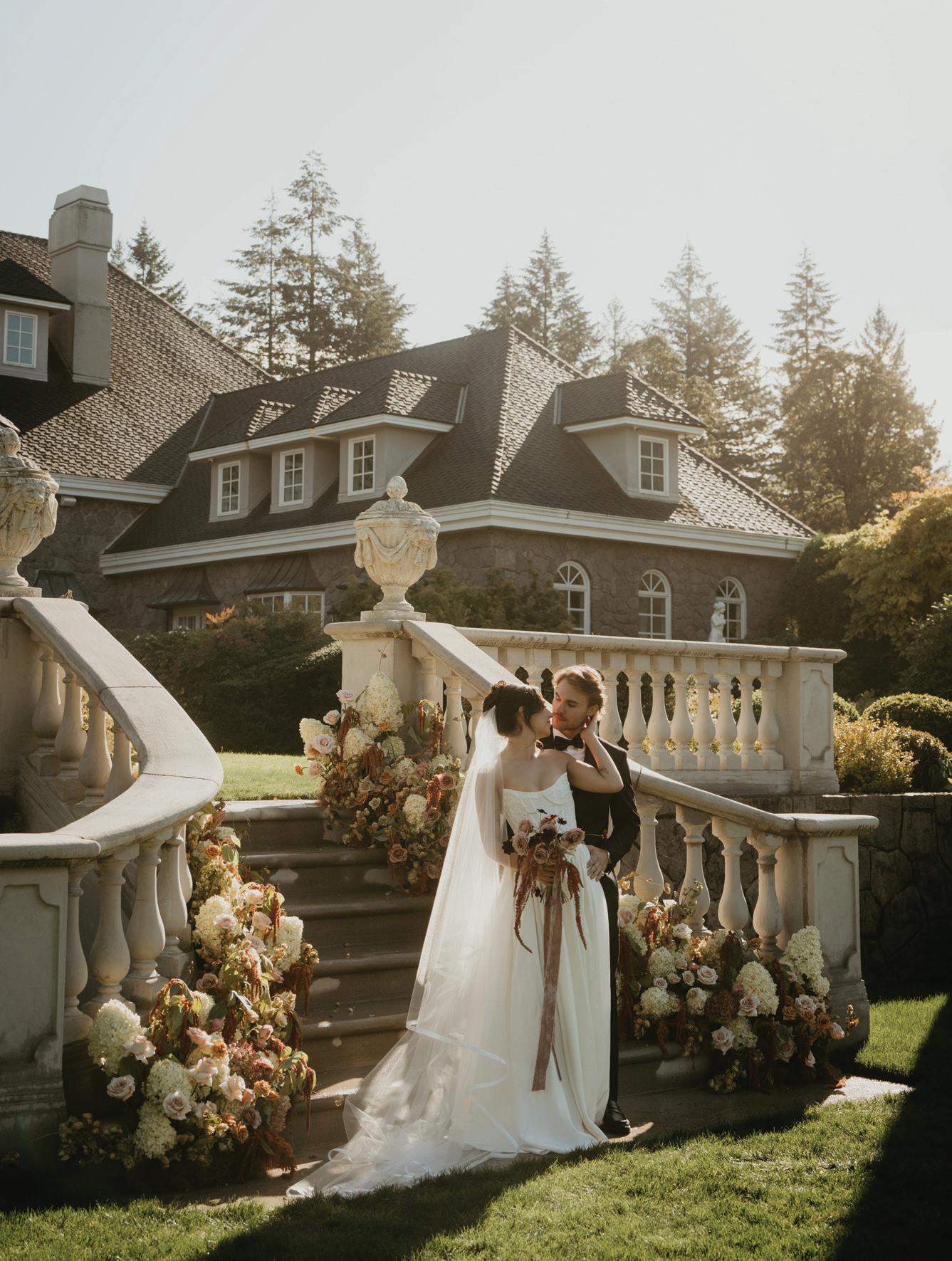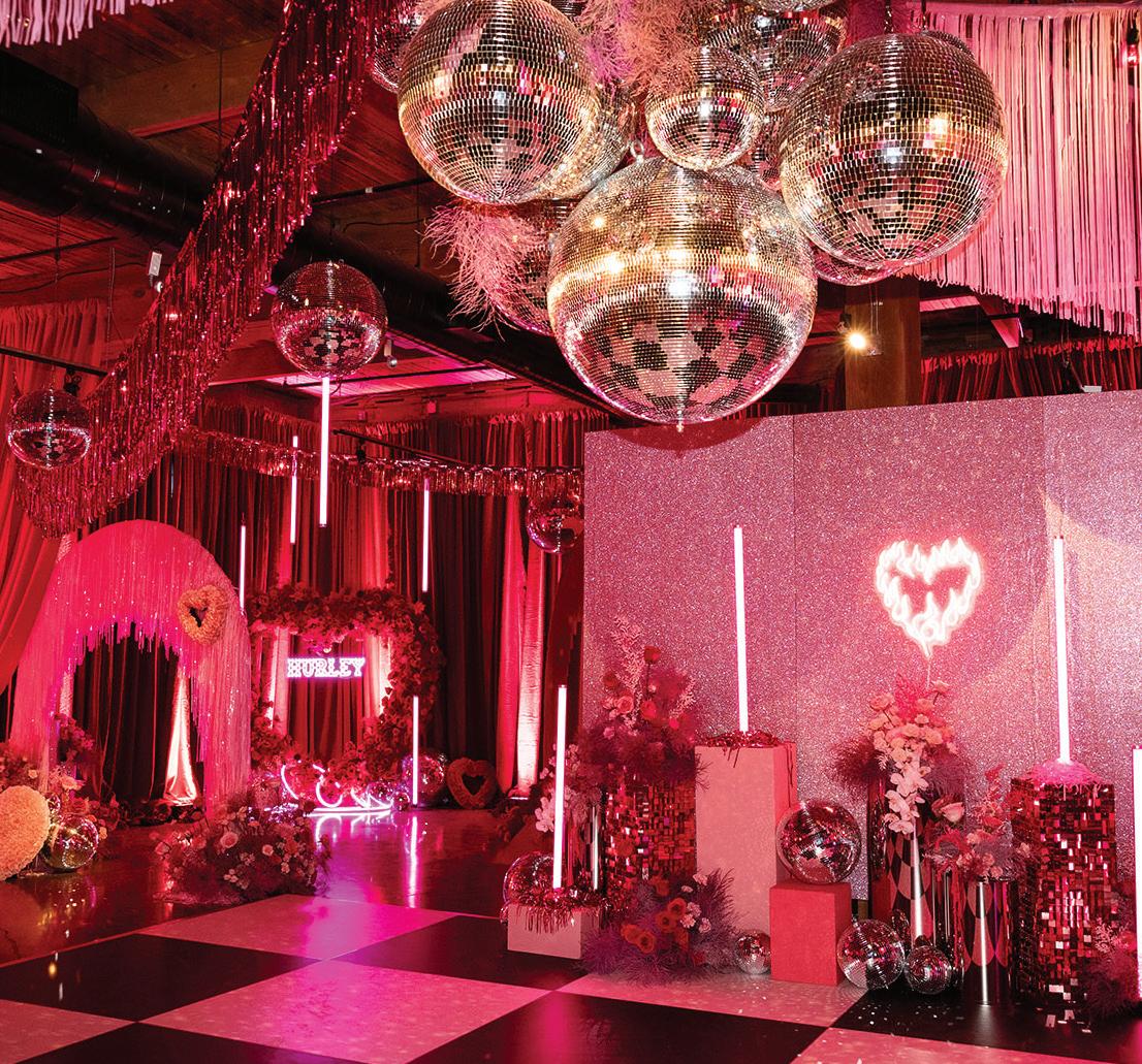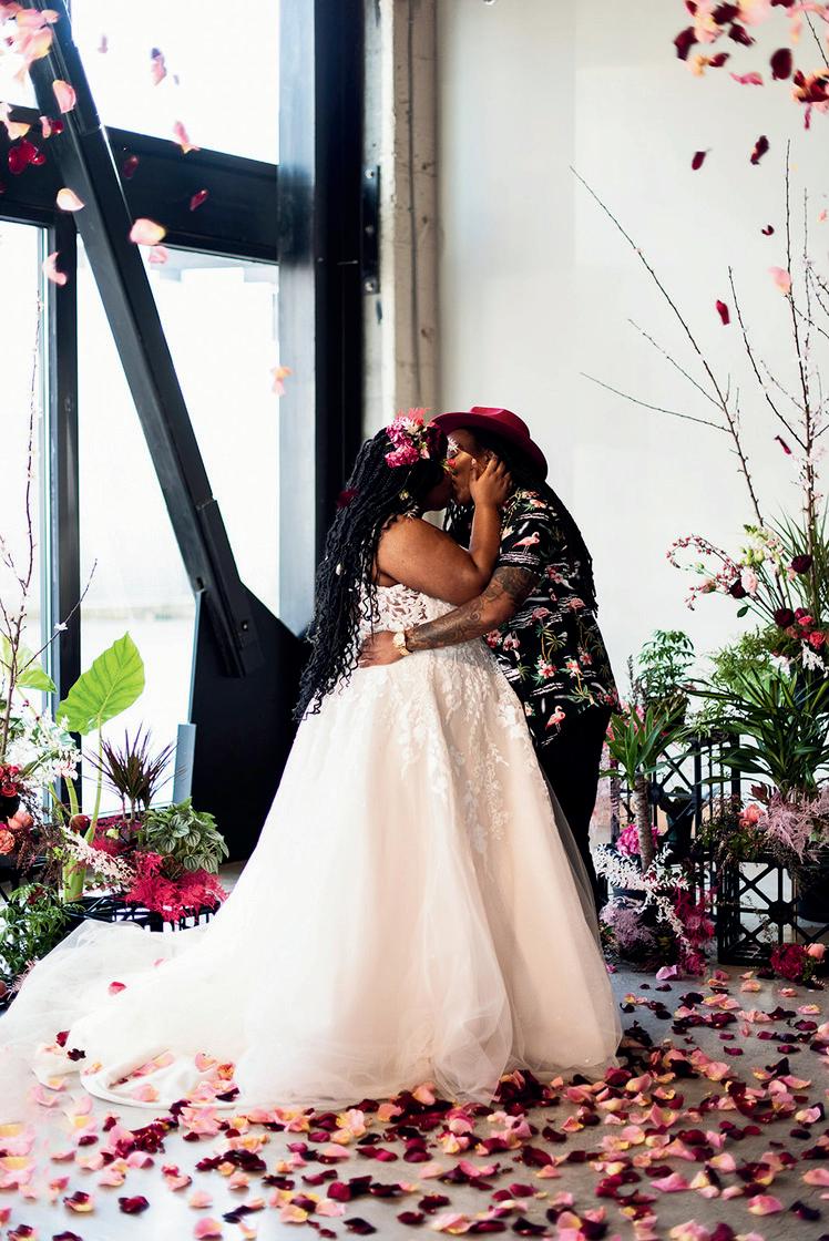 Erin Anderson and Charlotte Weller’s wedding weekend perfectly reflected the duality of the couple’s interests with a warm, intimate ceremony followed by a lively dinner and dance party. The happy couple wanted to honor both their love for the outdoors and their passion for exploring city life with a two-day excursion, each day inspired by their complementary hobbies. Under an overcast sky, Charlotte and Erin’s vision for a cozy ceremony came to life on the verdant grounds of Rex Hill Winery. Erin and Charlotte opted for unique textures and color combinations when it came to their floral arrangements. Romantic blooming dahlias, roses and zinnias were paired with playful ornamental kale, amaranth and smoke bush in colorblocked hues of burgundy, bright pink and creamsicle orange. Charlotte’s black satin puff-sleeved gown contrasted beautifully against Erin’s whimsical floral lace, a visual representation of their dynamic personalities. Their tear-jerking ceremony, framed by moody florals, was followed by a simple cocktail hour, during which guests reveled in the newlyweds’ love. The following day, elegant signage stated, “Join us at the Love Club,” inviting Charlotte and Erin’s loved ones for an evening of dinner, drinks and dancing. Soft shades of sage served as an accent, gracing the tablescape and custom matchboxes. Embroidered hats, heart-shaped sunnies and light-up foam sticks were offered as accessories for the dance floor. After a lively dinner and dancing, Erin and Charlotte gifted their guests with custom cookies showcasing their beloved pet as a sweet ending to their day. —Ryley S. Hoff