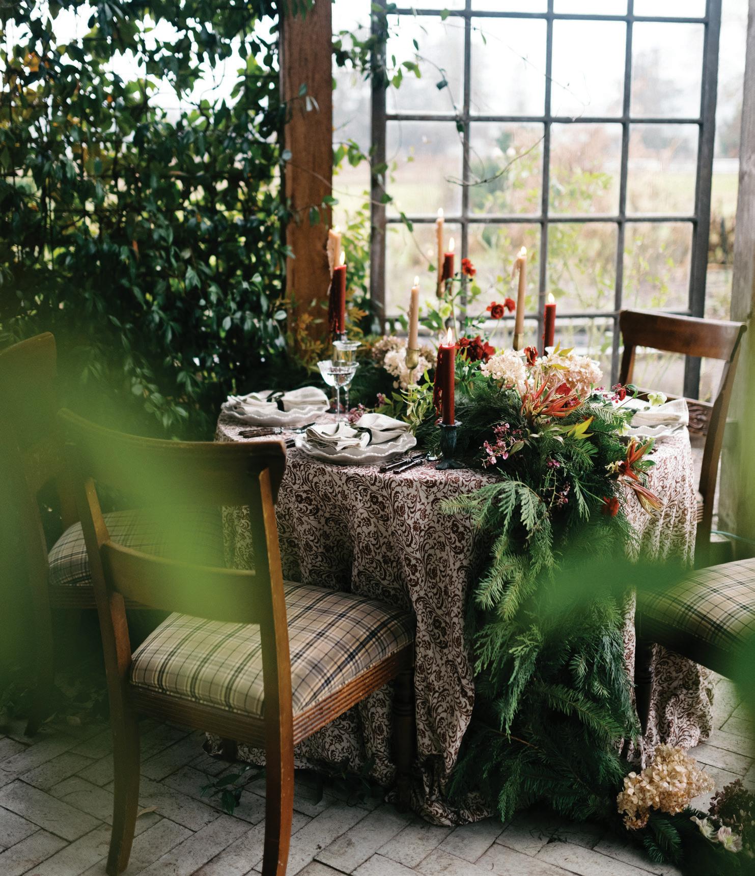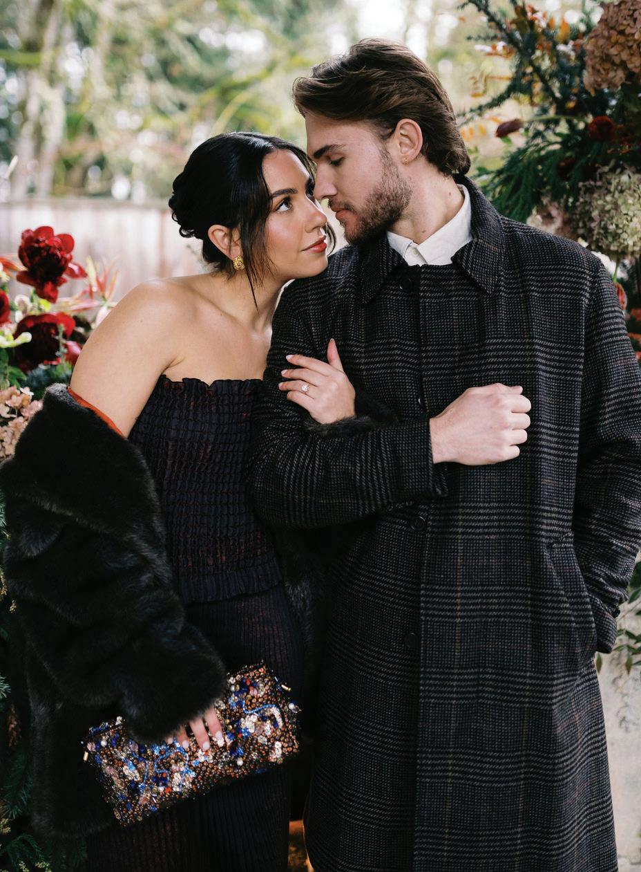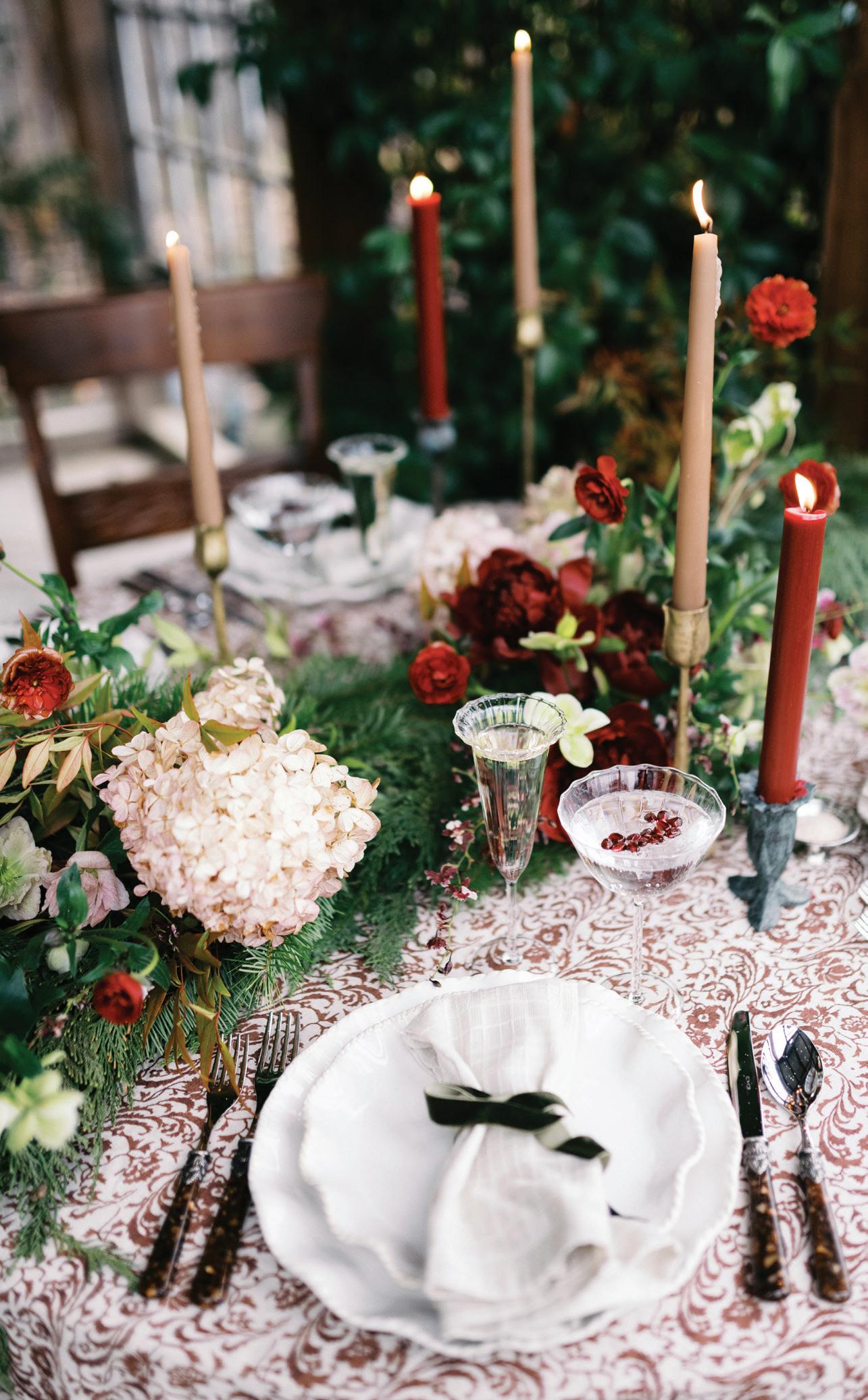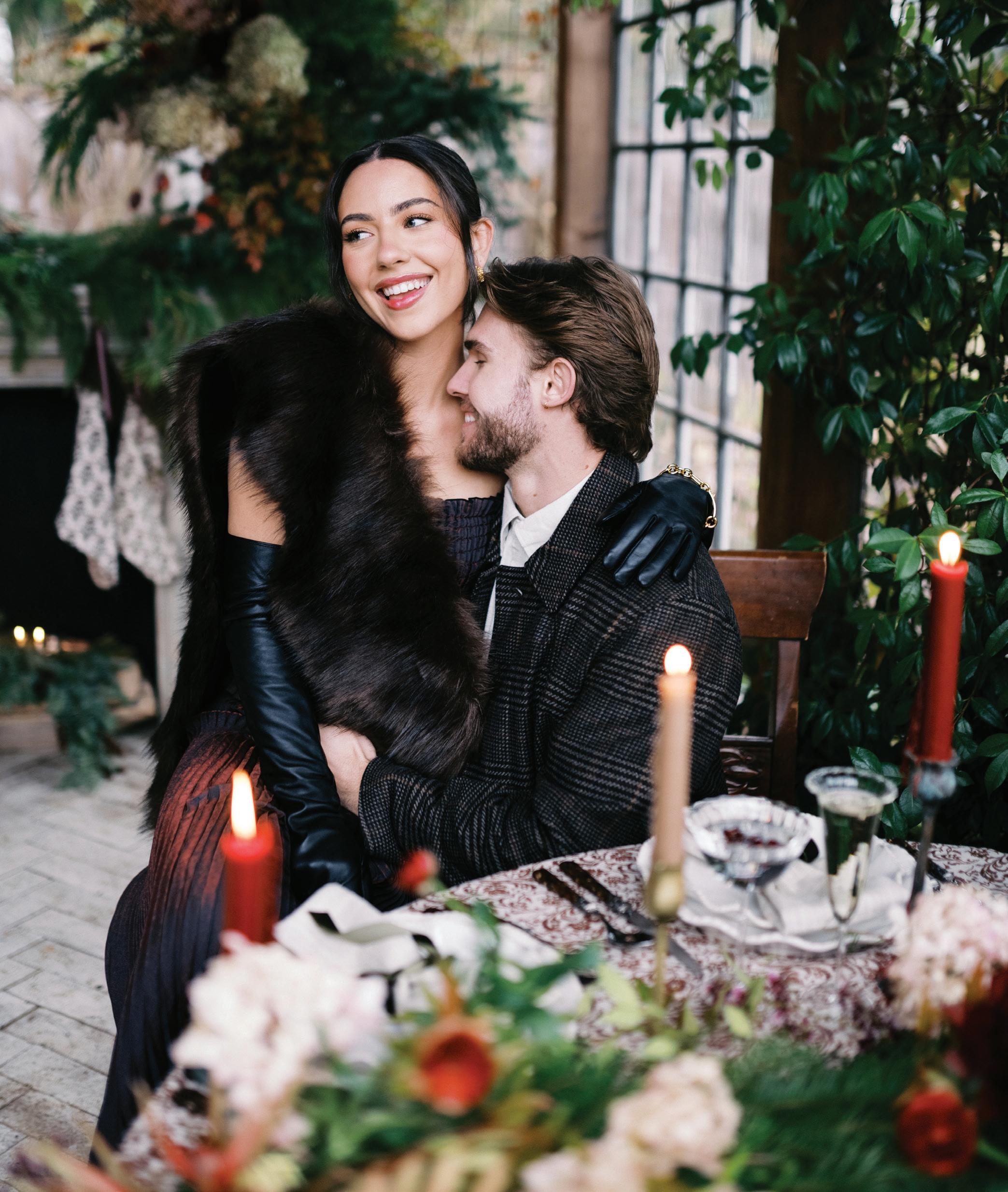 Bringing together the old-world elegance of Europe and the rustic, organic charm of winter, Kara Cederberg, owner of KC Experiential House, and a team of top-notch vendors crafted a design that expertly reflected the romance and warmth of the festive season. On a cloudy December day, soft natural light beamed through the glass walls of Seventh Stem’s private greenhouse and onto arrangements of forest green, burgundy and blush hues, woven together to create a seamless table runner that waterfalled onto the floor. Vintage dishware and mismatched candlestick holders made the space feel cozy and lived in, a stunning contrast to the delicate and sophisticated glassware. The intimate table design featured a gorgeous white and burgundy tablecloth and complementing pomegranates— symbolic of life, prosperity and good fortune in many cultures. Embracing the cold weather in fur and wool ensembles, the real-life couple epitomized timeless glamour. Overall, the aesthetic embodied Cederberg’s vision of “cultivated beauty and effortless refinement, where the holiday romance unfolds through lush greenery, candlelit gatherings and heirloom details.”