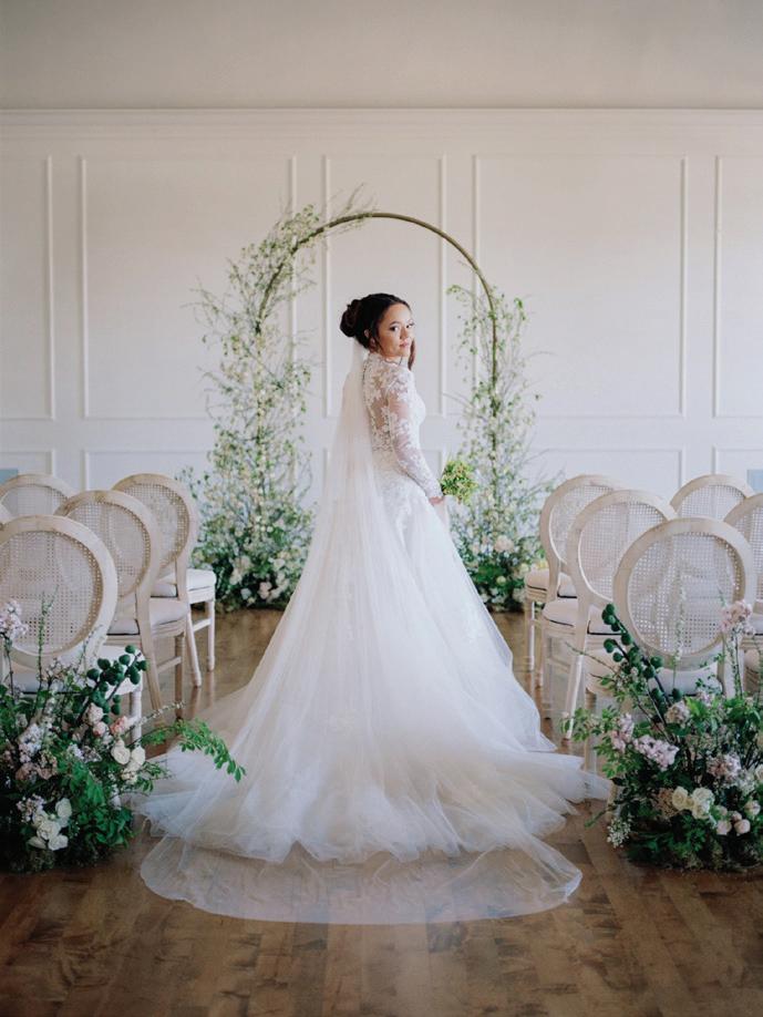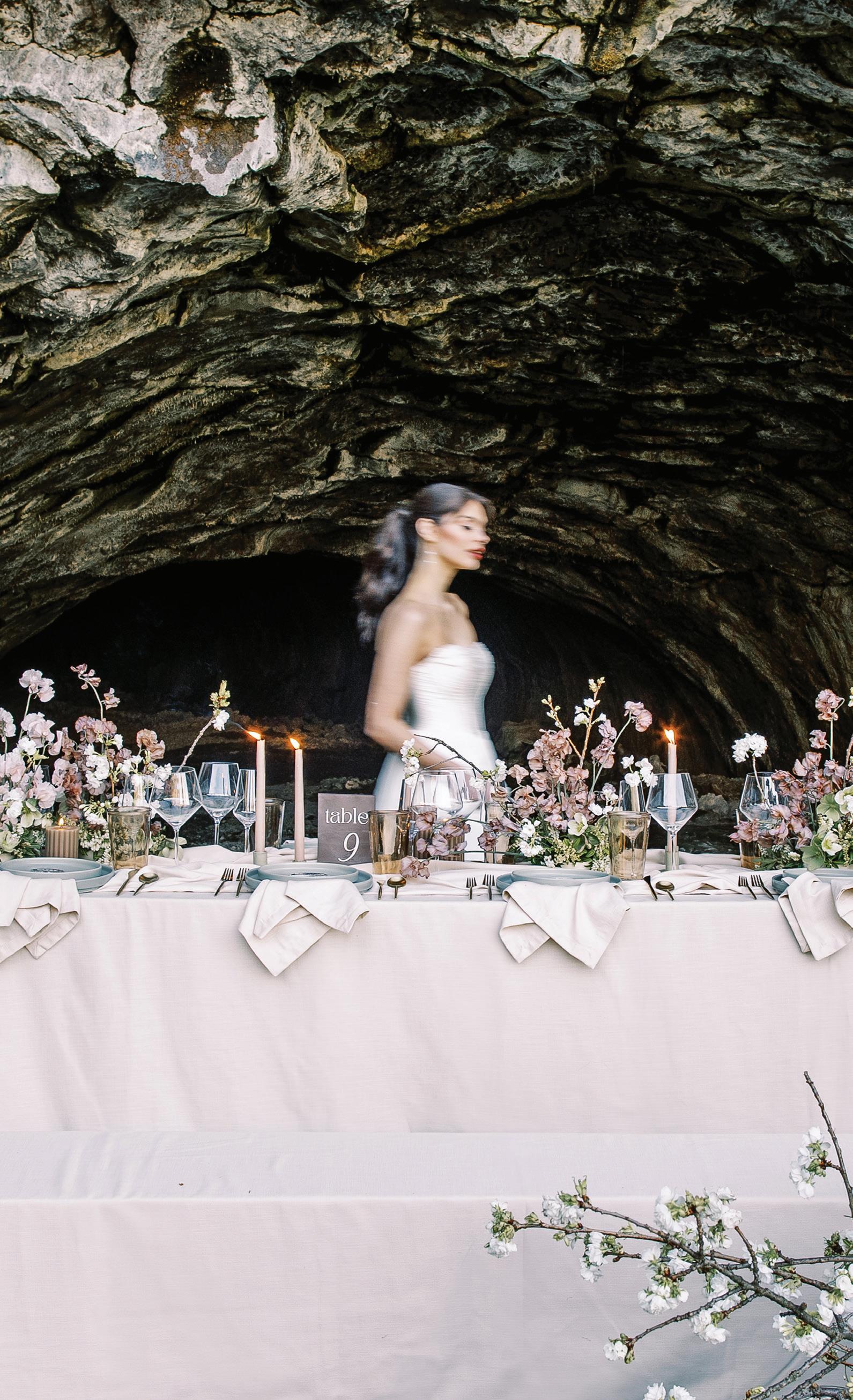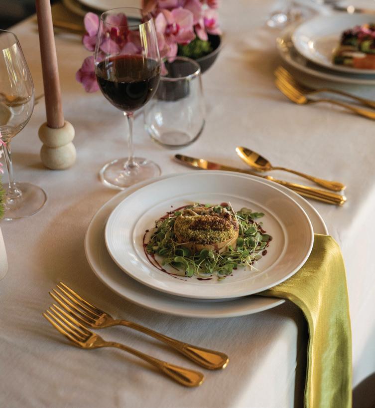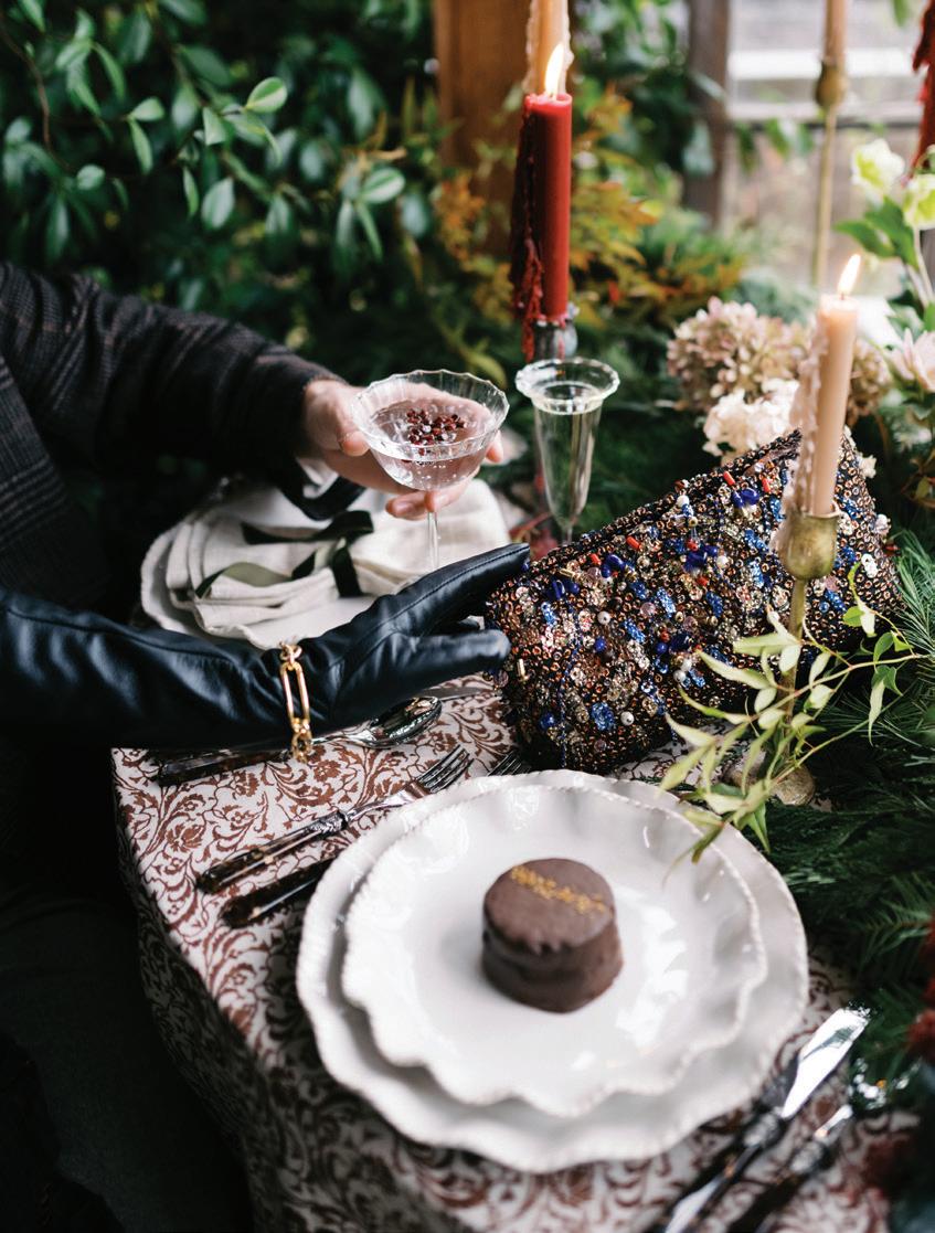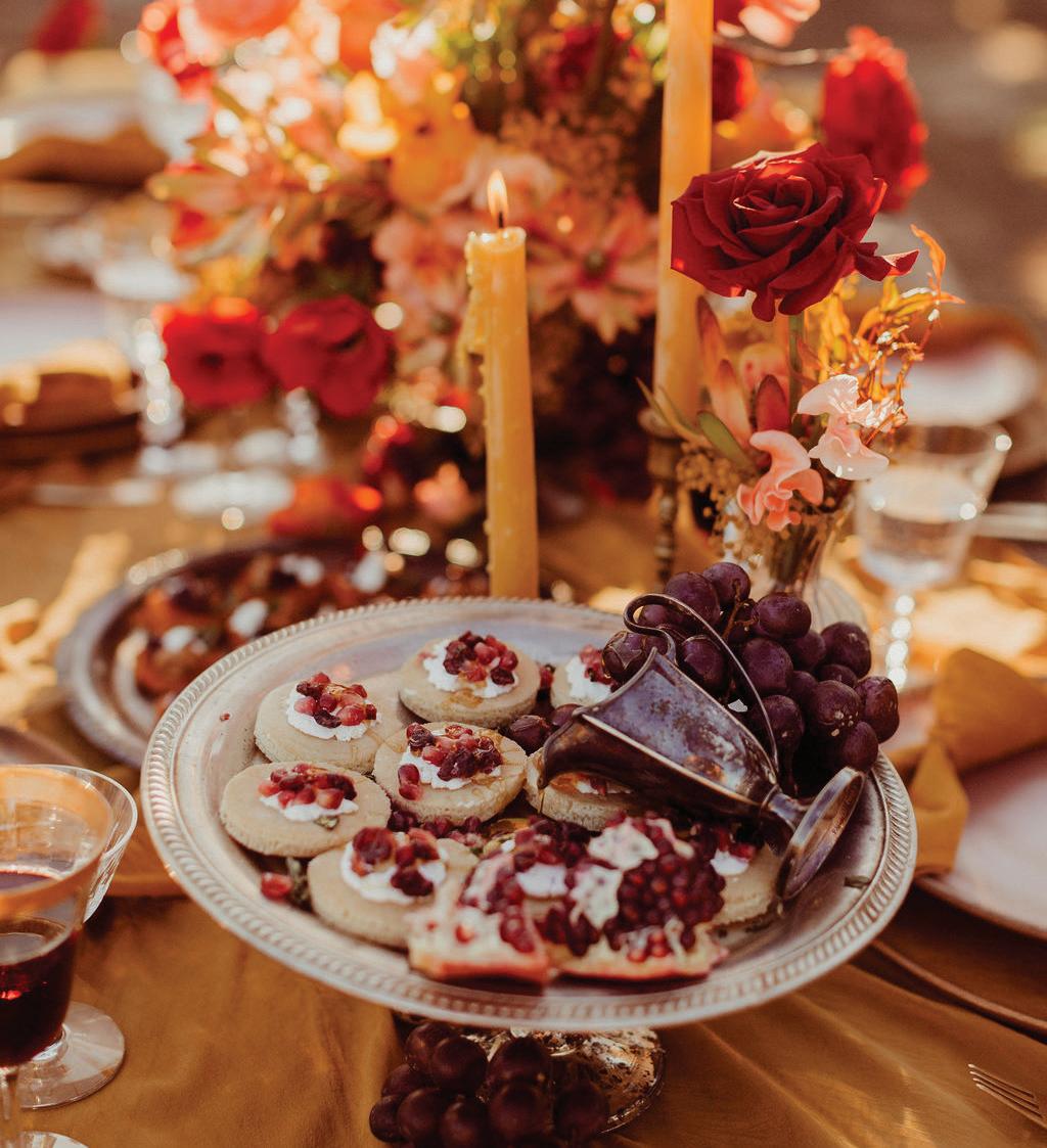 Bringing together the old-world elegance of Europe and the rustic, organic charm of winter, Kara Cederberg, owner of KC Experiential House, and a team of top-notch vendors crafted a design that expertly reflected the romance and warmth of the festive season. On a cloudy December day, soft natural light beamed through the glass walls of Seventh Stem’s private greenhouse and onto arrangements of forest green, burgundy and blush hues, woven together to create a seamless table runner that waterfalled onto the floor. Vintage dishware and mismatched candlestick holders made the space feel cozy and lived in, a stunning contrast to the delicate and sophisticated glassware. The intimate table design featured a gorgeous white and burgundy tablecloth and complementing pomegranates— symbolic of life, prosperity and good fortune in many cultures. Embracing the cold weather in fur and wool ensembles, the real-life couple epitomized timeless glamour. Overall, the aesthetic embodied Cederberg’s vision of “cultivated beauty and effortless refinement, where the holiday romance unfolds through lush greenery, candlelit gatherings and heirloom details.”