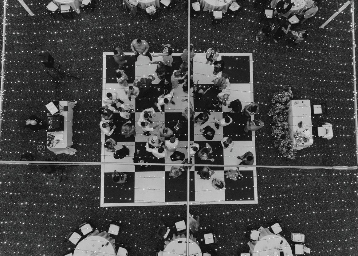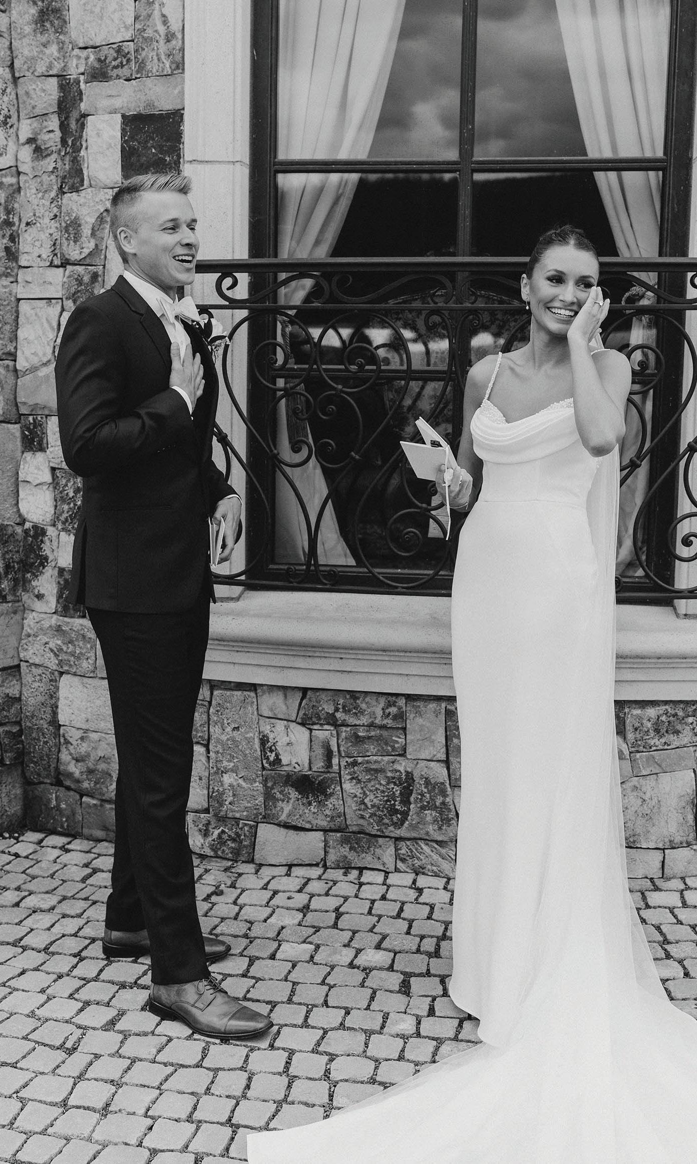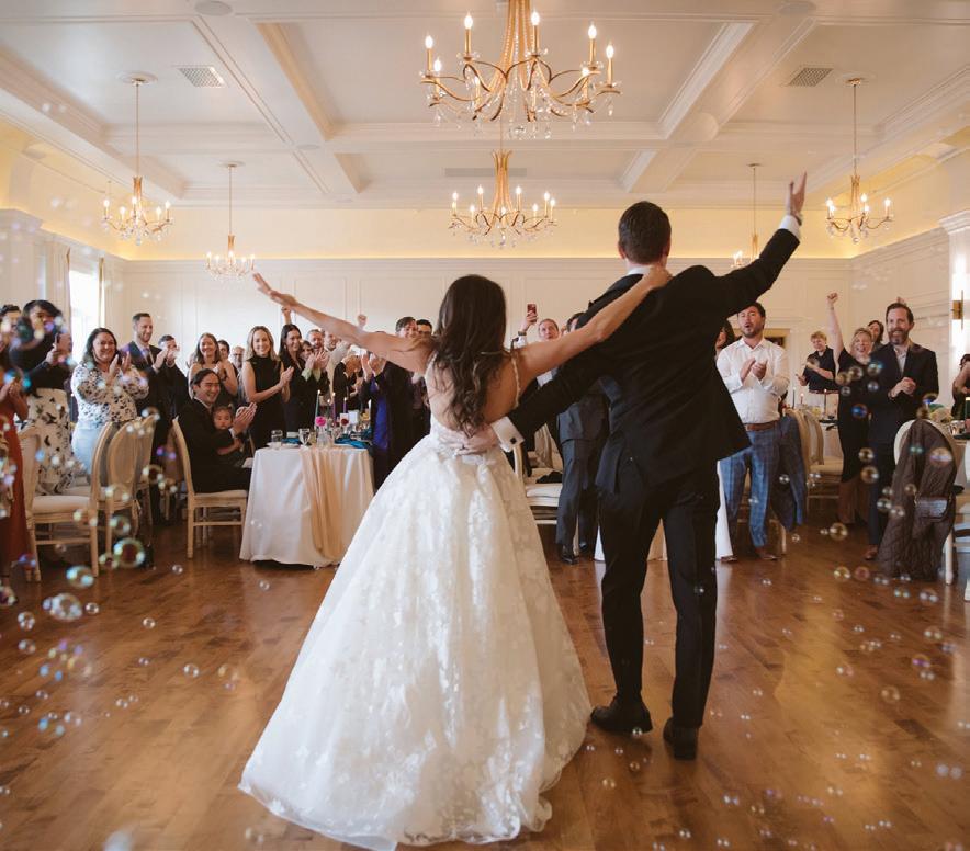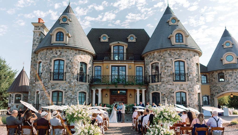 It is impossible to imagine that Stephanie Wilson and Nate Dykes knew just how spectacular their big day would be when they decided to host it at Chateau De Harpe. From the outside, the venue offered picture-worthy architecture and lush greenery at every turn, which was nearly rivaled by the elegant European design of the interior. Stephanie, a vision even in her getting-ready attire, was a sight to see as she walked down the aisle in her modern sheath dress, accentuated with draping and pearl detailing at the bodice, and a petite bouquet of white roses in her hand. In the words of Taylor Howie, owner of Howie Photography, “The groom’s eyes said it all—his love for her was undeniable.” After matching bronze-gold rings were exchanged, the party made its way to cocktail hour, where the couple’s signature drinks were served. Excluded from the sophisticated white and black theme were the light yellow bridesmaid dresses, a fun pop of color. A seating chart of muted, natural tones adorned with bud vases invited the newlyweds’ “Best Buds” to find their seats in a soft and pleasing way. As the stars came out over the twinkling lights of the celebration, the guests and bridal party alike began to hit the checkered dancefloor, where the groom and his bride—who had changed into her standout reception dress—danced hand in hand, making memories that will last them a lifetime. —Kaitlyn Meehan