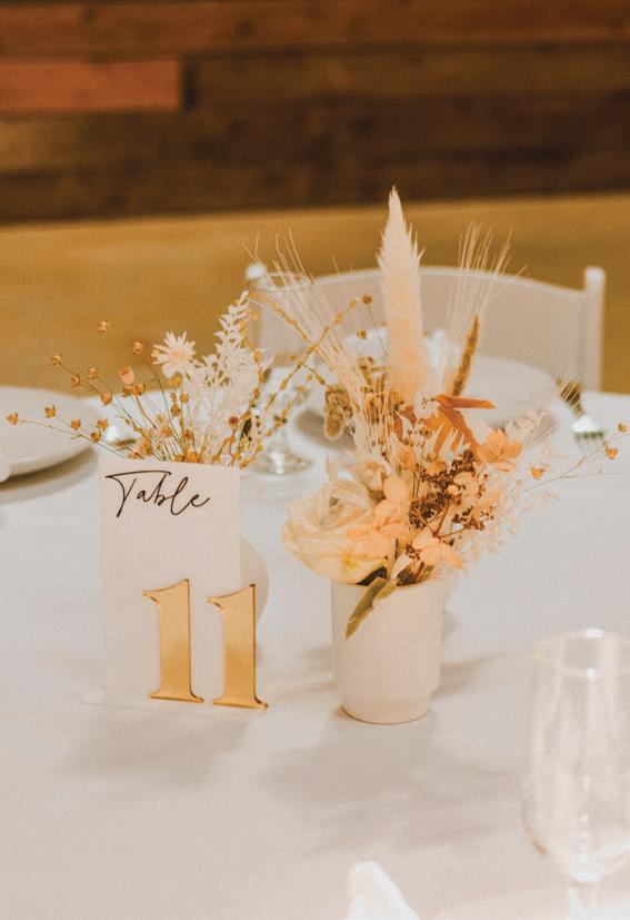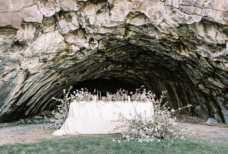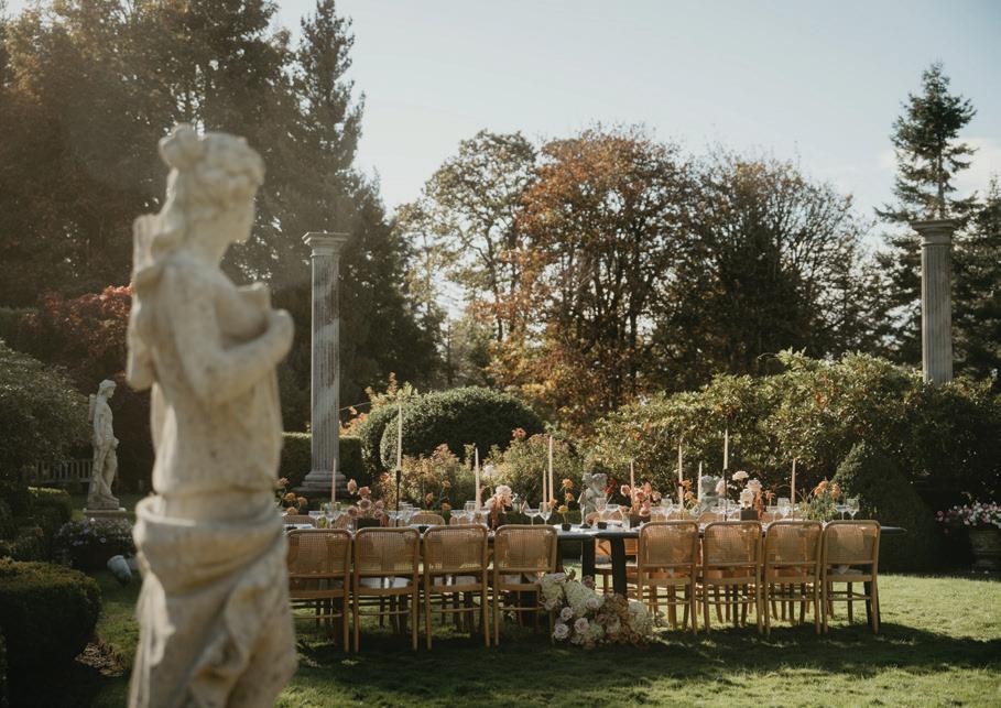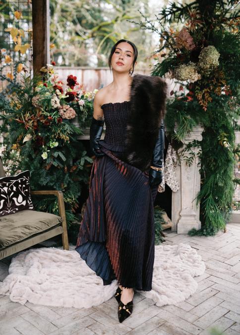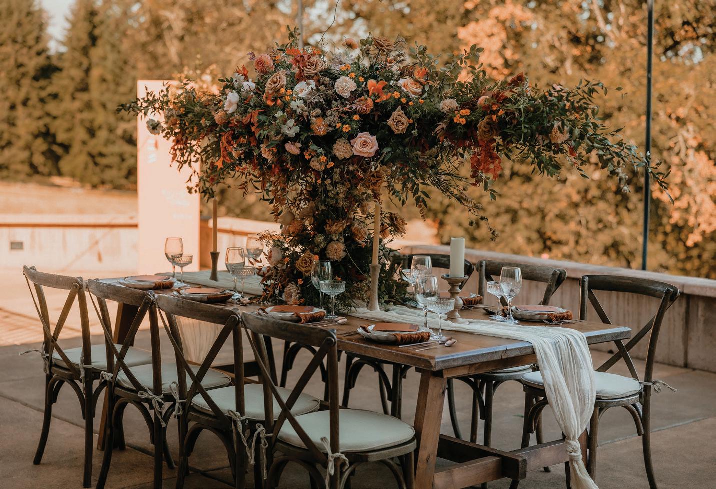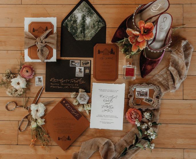 There is nothing quite like fall in the Pacific Northwest. The crisp air, the festive feeling and, of course, the colors. Wanting to capture that very essence, Renee Walker of Beaneth the Pines created an amazing scene for love to flourish. The design was inspired by the color palette of an Oregon autumn, including deep, rich tones represented in the florals, drinks and makeup, which then contrasted with the warm wood of The Inn at Diamond Woods. The reallife couple met when Clarae was reading for a role in an indie movie, and Ollie was already cast as the lead. They started filming two years later in October 2023. Clarae notes that this time of year is so special to them as a couple, “You know that song ‘We Fell in Love in October?’ That’s why I love fall. That is literally us.”