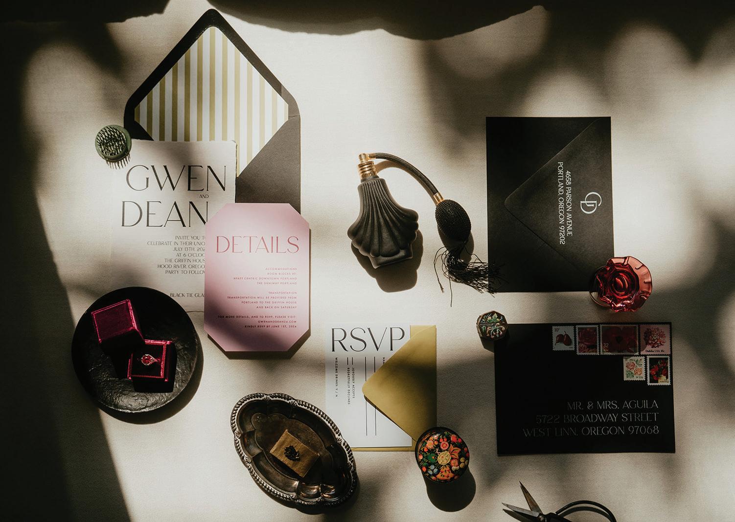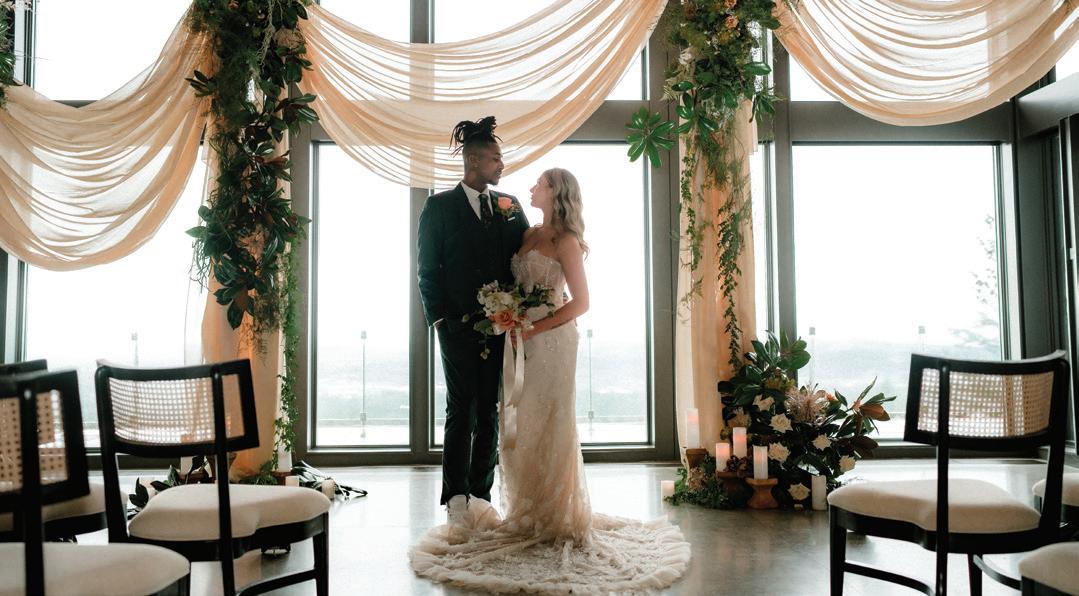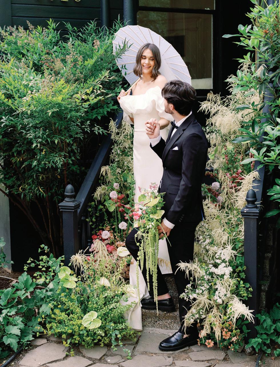 Jessica Mensah and Jeremy Da Rosa wanted their wedding to be an outward reflection of who they are both individually and as a couple. They met in Portland, so they knew they wanted to get married in the City of Roses and show their family and friends the beauty of summertime in the Pacific Northwest. The theme “City Meets Nature” emerged for their wedding weekend, starting with a traditional Ghanaian celebration where guests were encouraged to wear African attire or clothing that honored their own cultures. For their wedding day, a sophisticated palette of black, sage green, forest green, gold, champagne and stone created a garden oasis in the middle of the city. The décor included ferns, towering bamboo and Ficus trees, disco balls and lounge seating. The couple was involved in every detail of their wedding, including the custom stationery elements, hotel welcome bags and beyond—giving everything a highly personal touch. Jessica recalls: “Beyond our stated wedding theme, love was the other, and we felt so much love around us across the entire weekend. We would give the same advice we got: stay as present as possible and don’t sweat the small stuff.” —Chelsea Gibson