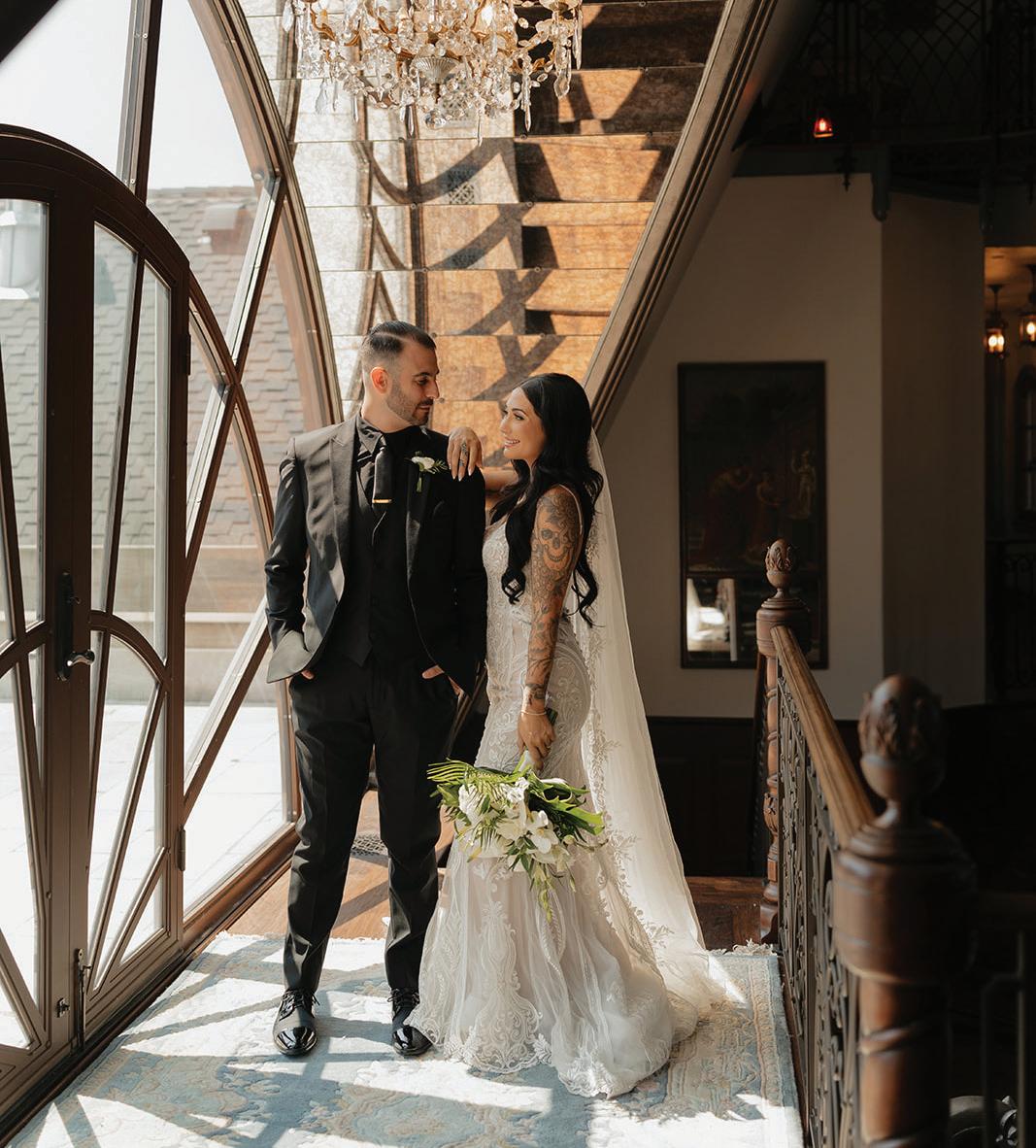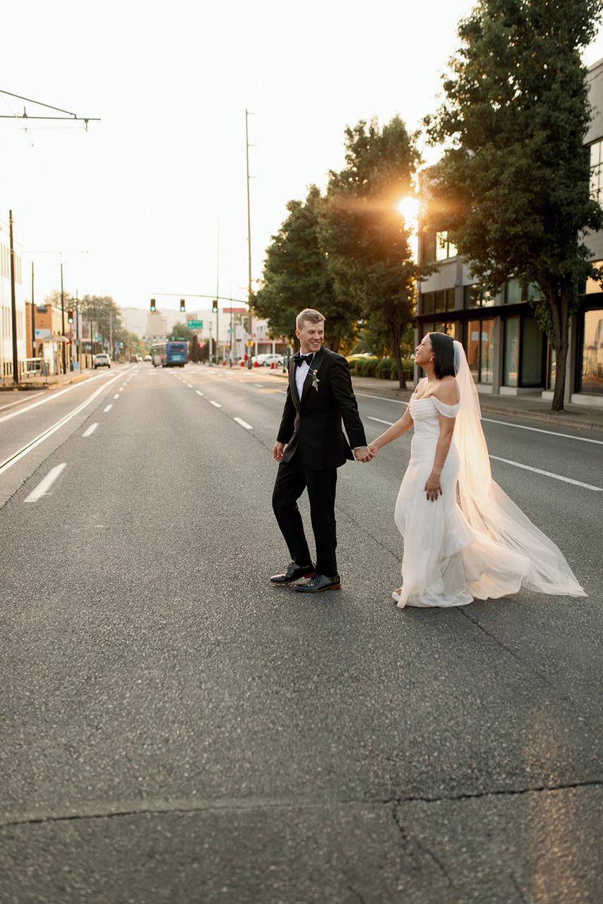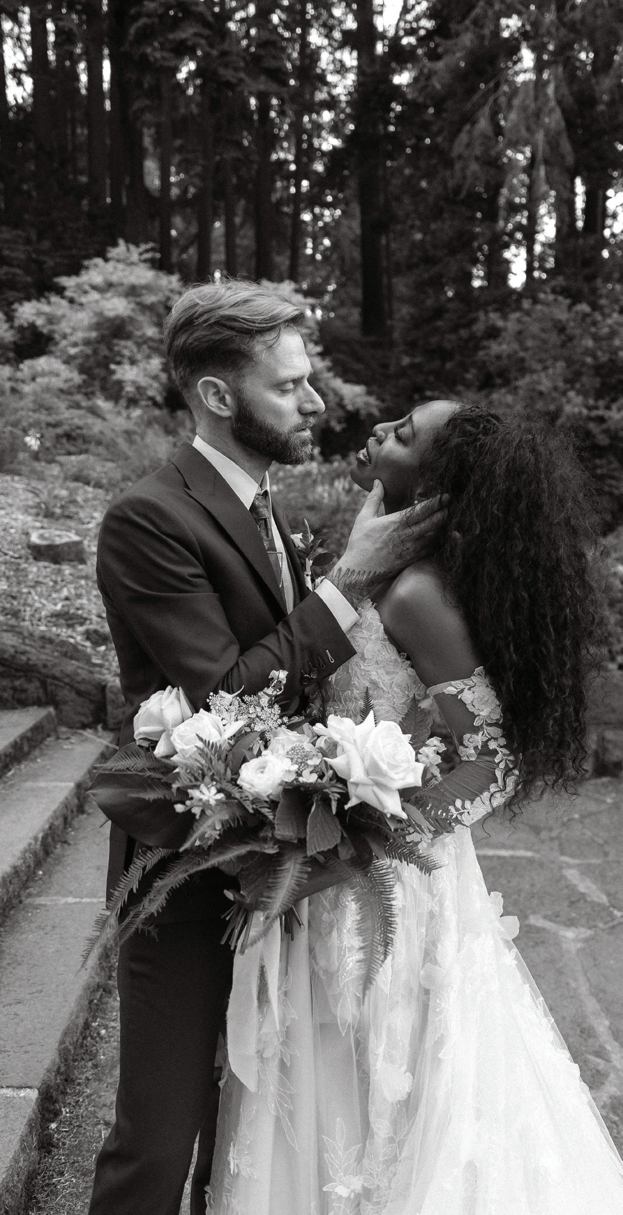 Jessica Mensah and Jeremy Da Rosa wanted their wedding to be an outward reflection of who they are both individually and as a couple. They met in Portland, so they knew they wanted to get married in the City of Roses and show their family and friends the beauty of summertime in the Pacific Northwest. The theme “City Meets Nature” emerged for their wedding weekend, starting with a traditional Ghanaian celebration where guests were encouraged to wear African attire or clothing that honored their own cultures. For their wedding day, a sophisticated palette of black, sage green, forest green, gold, champagne and stone created a garden oasis in the middle of the city. The décor included ferns, towering bamboo and Ficus trees, disco balls and lounge seating. The couple was involved in every detail of their wedding, including the custom stationery elements, hotel welcome bags and beyond—giving everything a highly personal touch. Jessica recalls: “Beyond our stated wedding theme, love was the other, and we felt so much love around us across the entire weekend. We would give the same advice we got: stay as present as possible and don’t sweat the small stuff.” —Chelsea Gibson