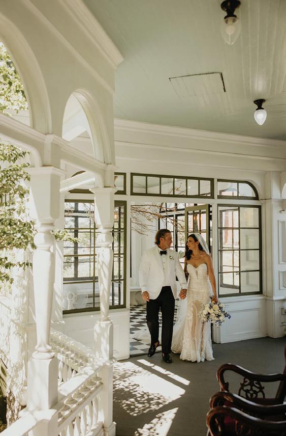 Nestled near downtown Salem surrounded by loved ones and shaded in the forest foliage, Sarah and Bobby Schacht became husband and wife on the magical grounds of Deepwood Museum and Gardens. Before starting the day separately, the pair gifted each other perfume and cologne bottles engraved with handwritten messages. Bobby and Sarah exchanged a deeply emotional and romantic first look, loving tears flowing under the pergola. Guests were greeted by unique signage featuring a custom wedding crest that would be woven throughout the day, portraying Sarah and Bobby’s life stories with hand-painted images of their pets, favorite drinks and a vintage getaway car. The already whimsical garden venue was enhanced with crisp white and blue blooms, which also graced the neck of Sarah and Bobby’s beloved dog and ring bearer, Penny. Sarah and Bobby exchanged their vows in attire that mirrored the sophisticated ethereality of their day. Bobby wore a timeless white jacket and Sarah donned an intricately laced strapless gown with a flowing veil embroidered with the phrase: “If anything could ever be this good again.” A vintage flair infused the tented reception, complete with romantic candlelight and pops of gold metallics and towering cala lilies placed alongside white roses at each table. Rich with personalized details and romantic ambiance, Sarah and Bobby’s wedding day set the tone for a loving lifetime together. —Ryley S. Hoff