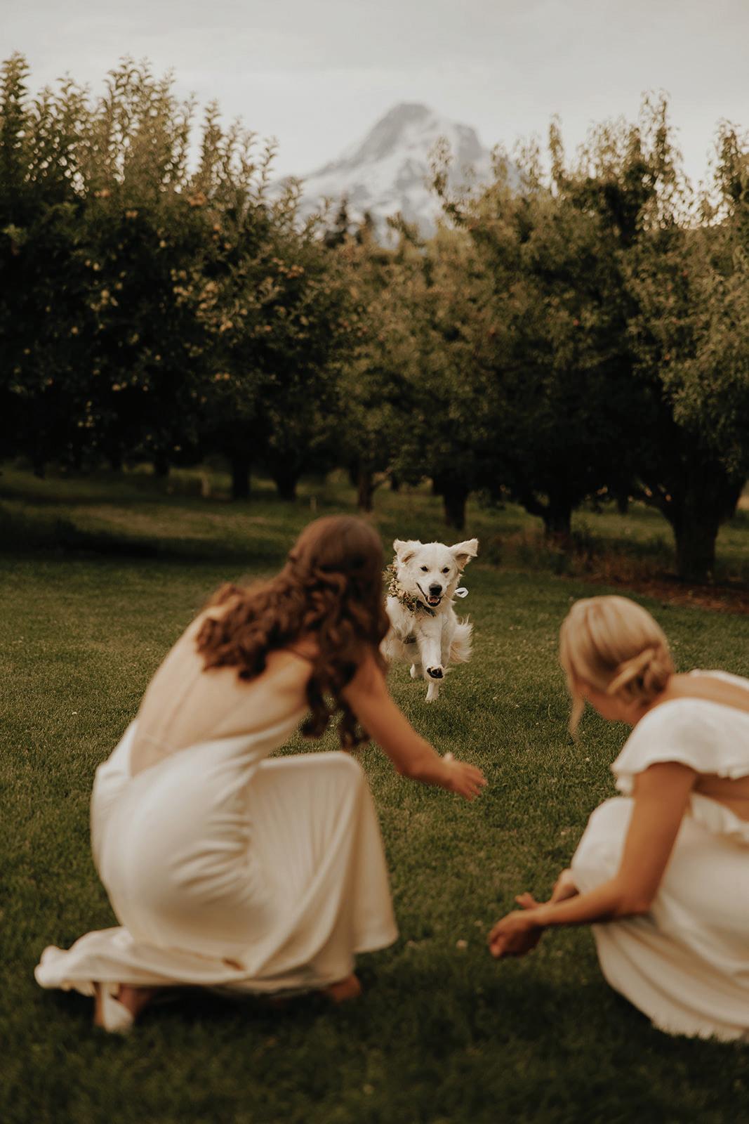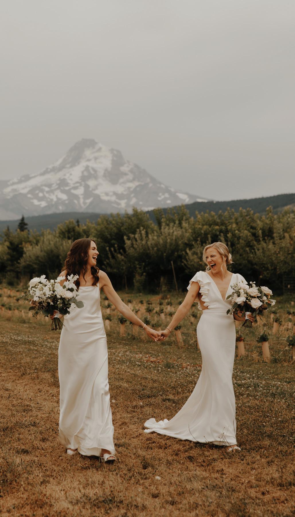 Bridal Attire: THE ELIZABETH DRESS by NILI LOTAN (Molly’s ceremony gown; @nililotan) and THE LUCY GOWN by ALEXANDRA GRECCO (Emma’s ceremony gown; @alexandragrecco) both from STILL WHITE (@stillwhite); DRESS THE POPULATION (Molly’s after-party dress; @dressthepopulation); RETROFETE (Emma’s after-party dress; @retrofete) Cake & Desserts: THE MOBILE SCOOP SHOP (@themobilescoopshop_icecreamcaterer) Pet Attendant: WAGS & GARLAND (@wagsandgarland) Florals: MOUNTAIN VIEW FLORAL DESIGN (@mountainviewfloraldesign) Hair & Makeup: THE WILDEFLOWER COLLECTIVE (@thewildeflower.co) Music: BLUE WAVE BAND (@bluewaveband) Photography: TORI OSTERAA (@toriosteraa) Rentals: RIVERHOOD RENTALS (table settings; @riverhoodrentals); WEST COAST EVENT PRODUCTIONS (stage; @westcoasteventproductions) Venue, Catering & Rentals: MT VIEW ORCHARDS (@mtvieworchardsweddings) Videography: AGC MEDIA (alpinegolfcollective.com) Wedding Coordinating: ANASTASIA YUE (@hareandharvest) at MT VIEW ORCHARDS (@mtvieworchardsweddings)
