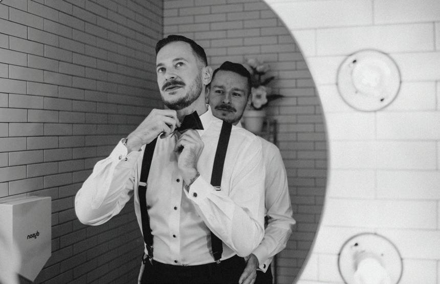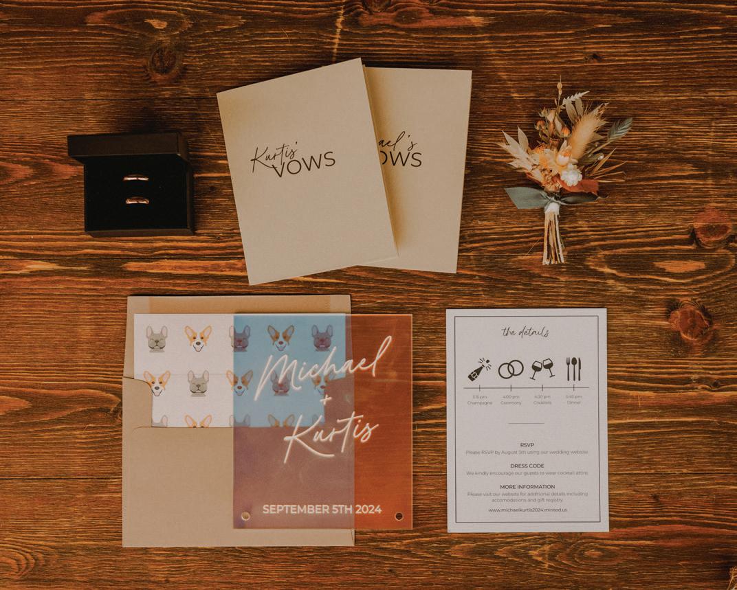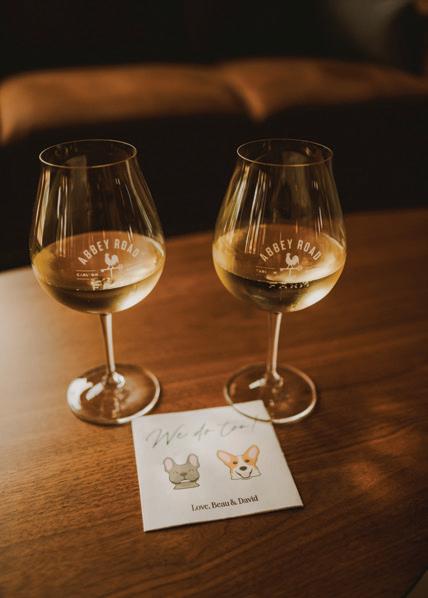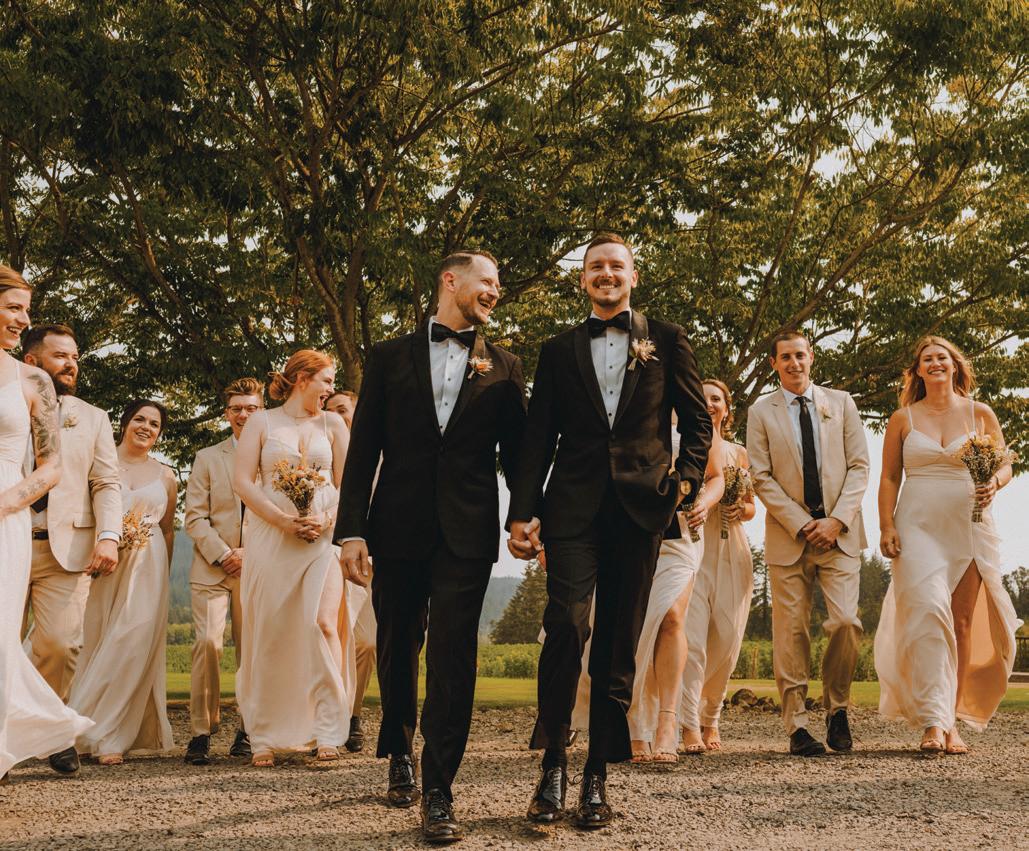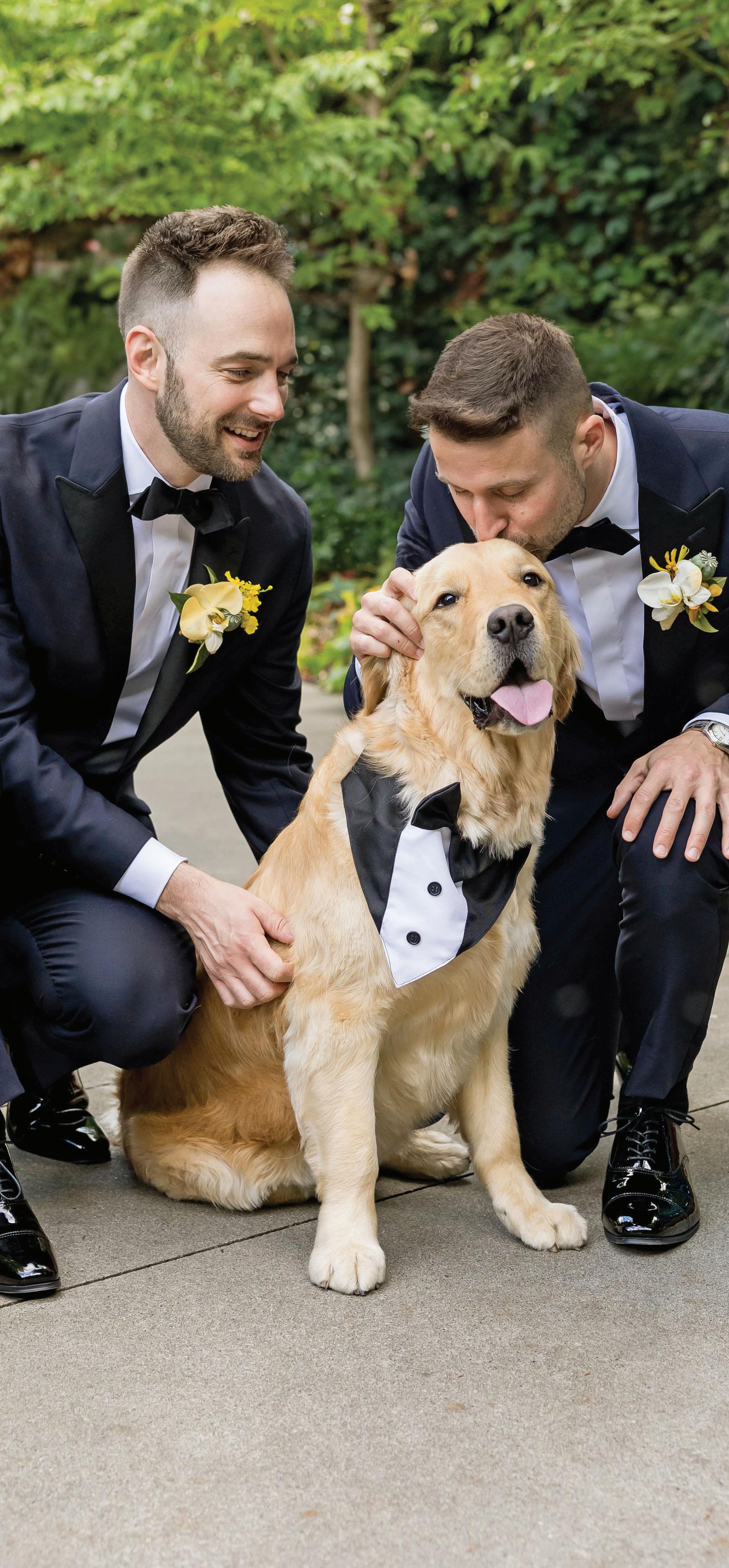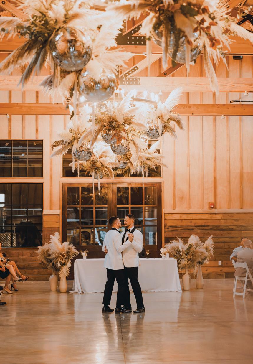 Amid all the uncertainty of the COVID-19 pandemic, Michael Coon and Kurtis Owen found something to rely on: each other. The couple met online and quickly bonded over movie nights, shared laughter and wine tasting. Abbey Road Farm’s winery was the perfect venue—as an architect, Michael adored the elegant design with exposed wood trusses. The couple embraced minimalism in their décor, letting the space’s natural beauty speak for itself. Every unique touch was intentional and expressed Michael and Kurtis’ bold personalities, like the three disco ball chandeliers accented with bright flowers that hung above the reception. Every floral arrangement from Botanica Floral Design featured a bed of dried flowers and pampas grass as a neutral base color palette, with bursts of brighter hues woven in. The sun-drenched outdoor ceremony featured stunning views of the surrounding fields and rolling hills. A set of rainbow smoke cans created an exciting moment, with the release of colorful clouds making for a beautiful photo opportunity. The celebration moved indoors for dinner and dancing, where an array of personal touches added to the warm atmosphere, including napkins featuring the couple’s treasured dogs, Beau and David. Several neon signs included some of their favorite phrases, and rainbows incorporated in the florals celebrated Michael and Kurtis’ authenticity and identity. The dreamy night could not have better represented the couple’s bold and unapologetically fun personalities. —Jasmine Shackleford