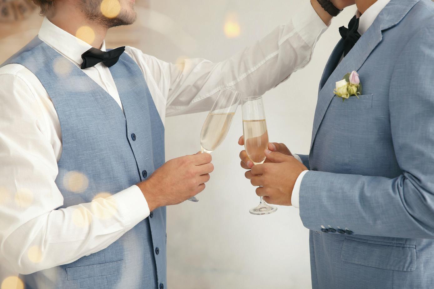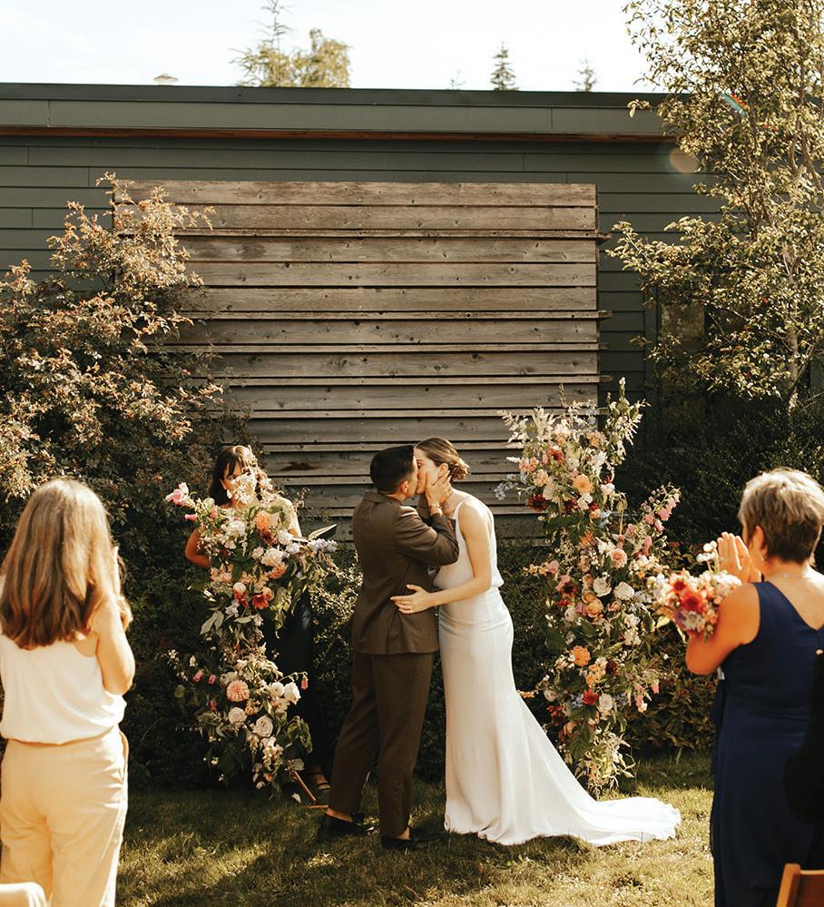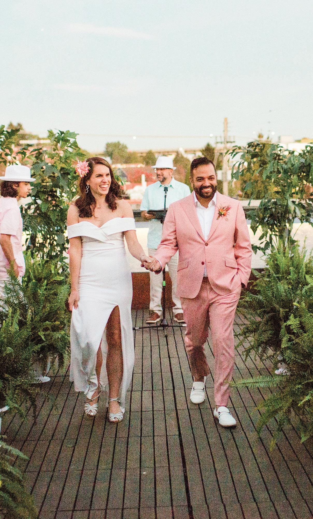varieties of vibrant pink and orange dahlias on the property. That effort resulted in a gorgeous ceremony arch brimmed with blooms and fresh greenery, some of that verdancy foraged by the grooms and their friends. Guests tossed fresh flowers as Daniel and Jake walked back up the aisle hand in hand as a married couple.