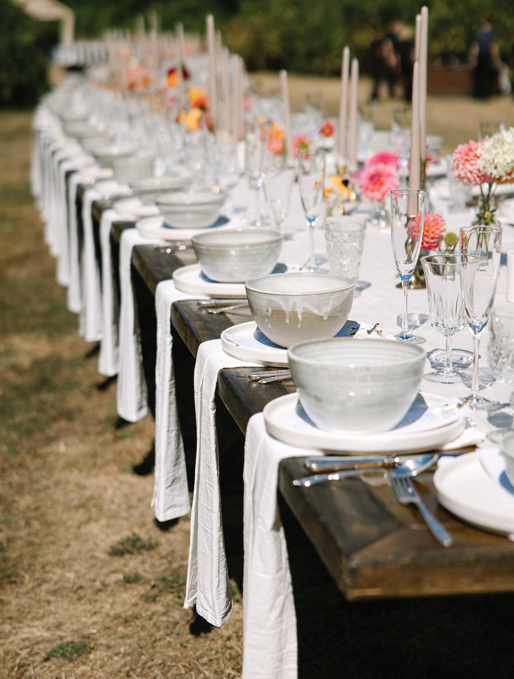 were put together to accomplish the enchanting 154-foot tabletop, set at a slight curve to best showcase the views of the property. The reception featured a delicious culinary spread: a gourmet salad prepared by friends of the couple; artisan bread from Balloon Roof Baking Company.; and a gorgeous array of bites provided by Tuxedos and Tennis Shoes Catering, which included antipasti, asparagus and goat cheese pizzettes, rosemary and goat cheese peppadews, bistro filets on bruschetta, and, of course, shrimp and bacon grits as an homage to Jake’s Texas roots. Each place setting featured a custom soup bowl handmade by the grooms, who also dabble in pottery. They personally served each guest a ladle of their favorite homemade soup (their own recipe), with the bowls doubling as heartfelt wedding favors.