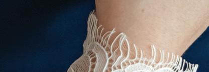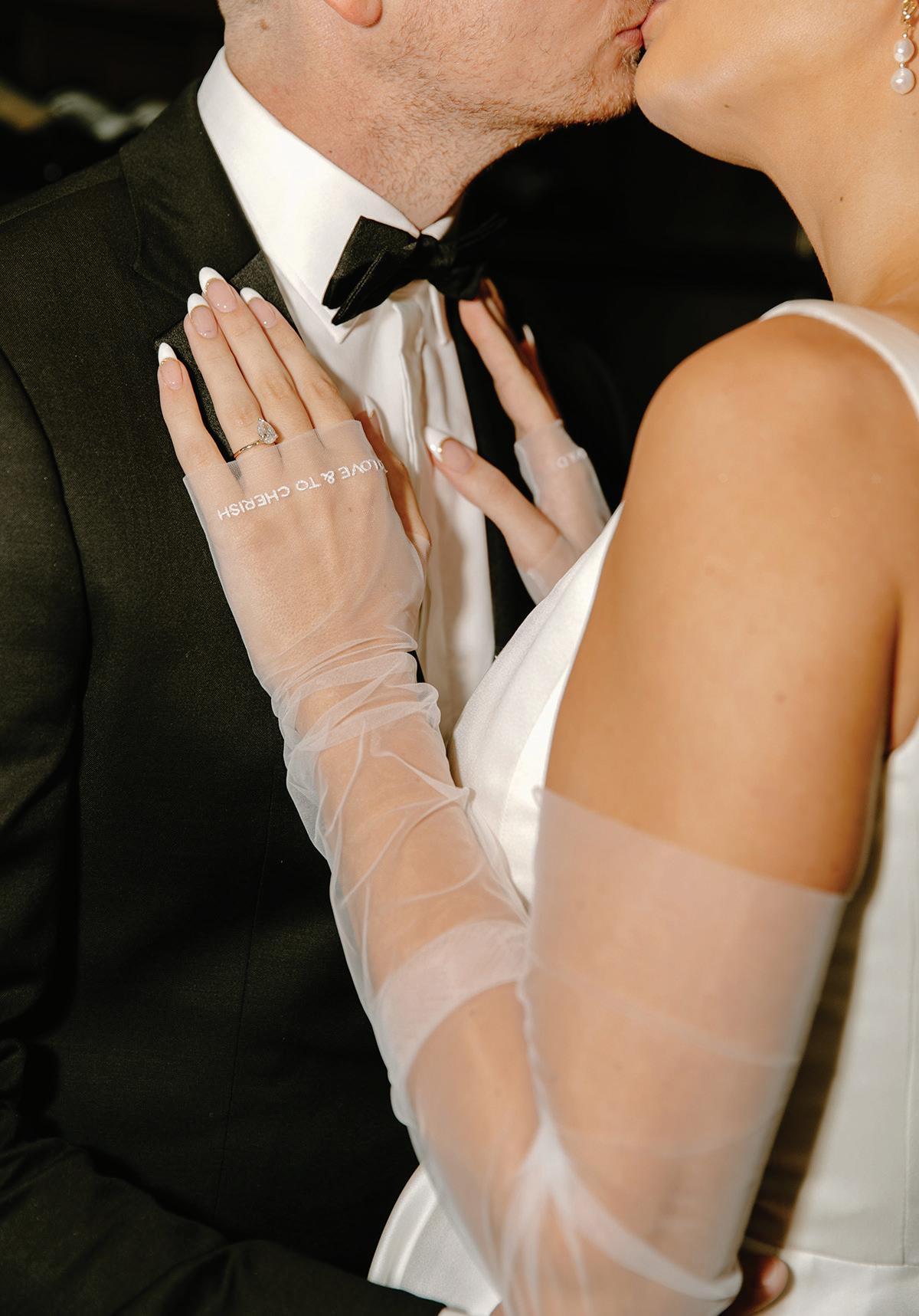 Delicate gloves are quickly becoming a bride’s favorite accessory. Kerry Parker’s bridal gloves perfected this wedding trend. The sheer gloves are embroidered with the vows “To Have and to Hold” and “To Love and to Cherish.” Each ladylike glove is hand-stitched and made to order according to your measurement. If you want to up the style factor, check out the full collection, which includes a variety of styles, textures and colors, such as the white “Pearlicious” with pearls, the ornate lace “Hot Mess” or the fingerless “Moondust” in a sheer black with sparkling sequins. —Catherine