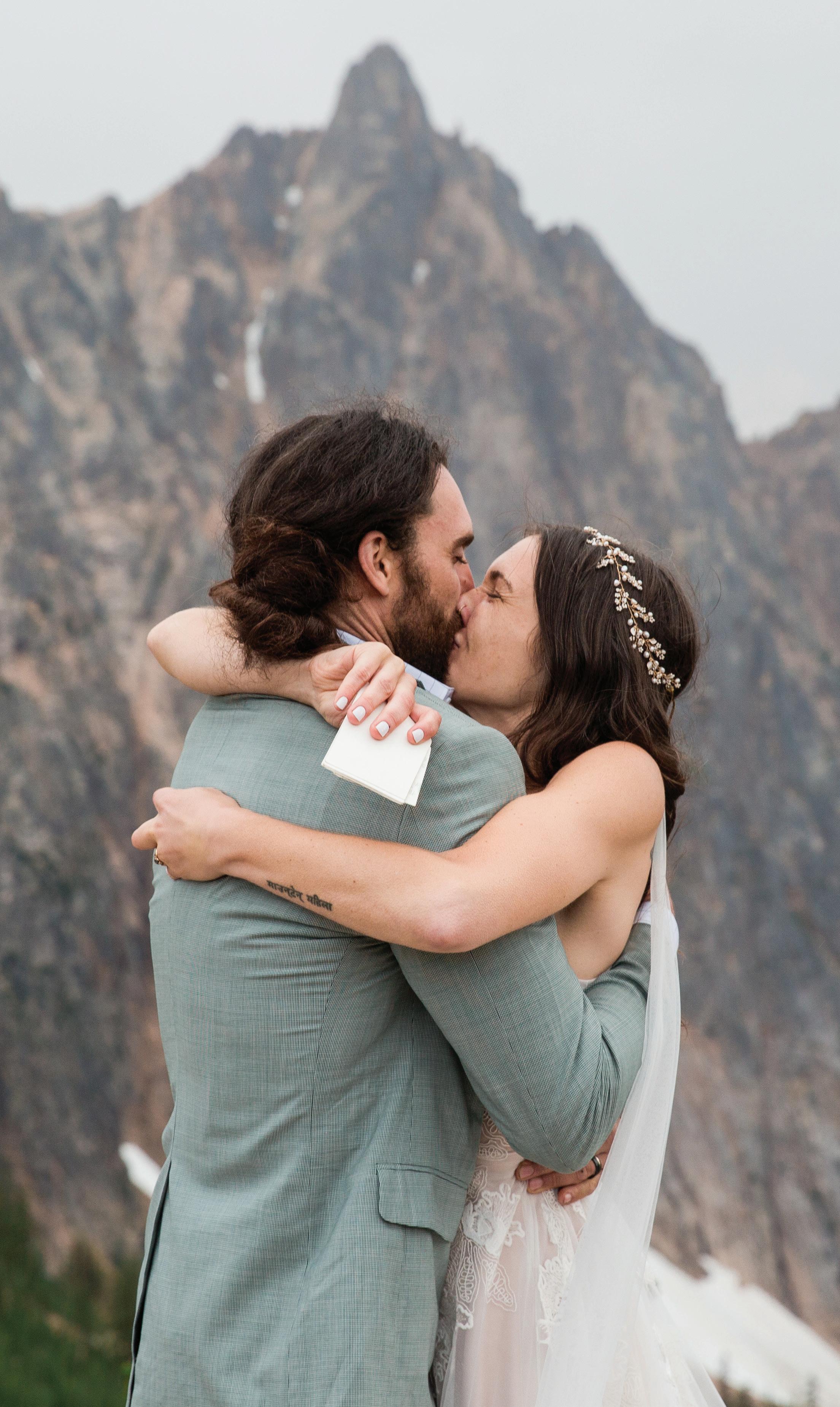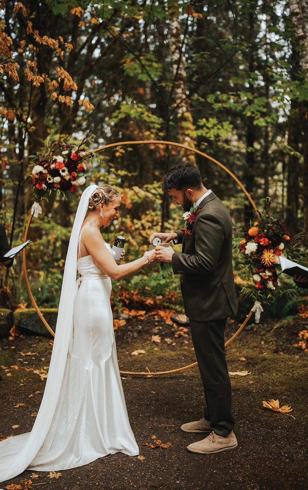 In a powerful display of love, Cyrrene Sharples and Max Perry braved a blizzard to say “I do” in Mount Rainier National Park. As true nature lovers, the couple wanted to embrace the elements of the Pacific Northwest and marry on the mountain where Cyrrene grew up. “Nature has always been central to how we spend our free time and how we harmonize with the world and within our relationship. So we knew we wanted to get married in nature,” Cyrrene said. In a secluded spot within one of Mount Rainier’s lush evergreen forests, Cyrrene and Max exchanged vows privately prior to the formal ceremony. Then they returned to Copper Creek Inn to marry with their loved ones surrounding them and their close friends officiating. Contributions from those loved ones were deeply felt: Max’s sister, , Jacqueline Perry, personally grew the gorgeous flowers that were used in the ceremony design; and the couple’s loyal dog, Mossy, served as ring bearer, proudly sporting a bespoke leather pouch attached to his collar. The reception kicked off with signature cocktails inspired by the bride, the groom and Mossy. As a parting gift, guests were given custom beanies featuring an illustration of Mount Rainier along with the date of Cyrrene’s and Max’s joyous union.