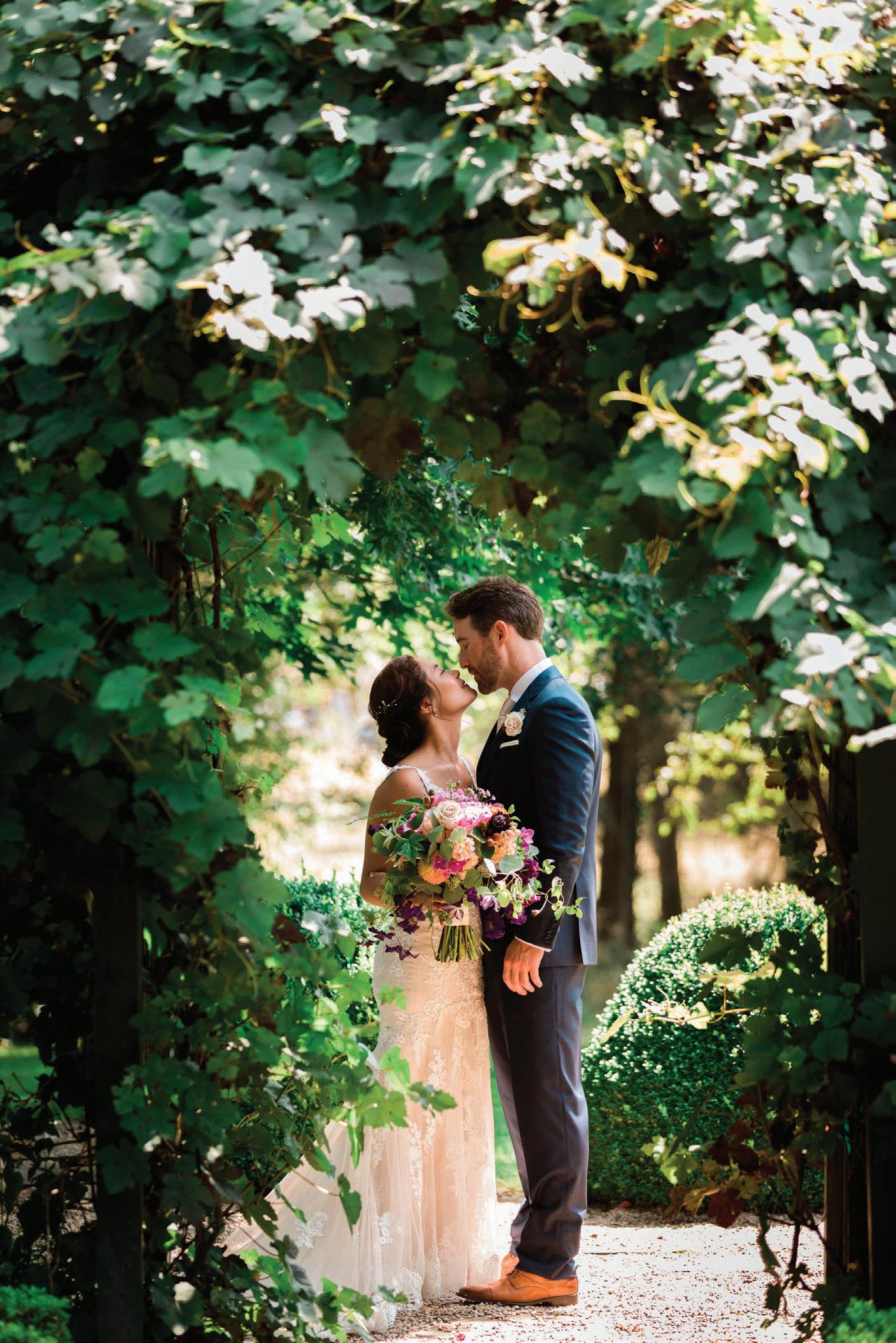 Stephanie Hodges and Buck Shinners were married last summer in a lovely country affair. And when it came to choosing a florist, it was a no brainer. The bride’s and groom’s moms—coined “the flower moms”—designed all the florals, which made complete sense since the two families have been in the Seattle floral industry for a combined 100 years. Seventy years ago, Buck’s grandparents were two of the original Asian flower vendors at Pike Place Market; they later bought two flower farms in Auburn Valley. Buck’s mother, Rosie, is still active in the floral industry, and she created the reception flowers, including a 1947 Willys Jeep spilling with blooms. Stephanie’s parents owned two flower shops over the years, and her mother, Myra, still works as a designer at DeLaurenti Florist. She designed the flowers for the ceremony, from the stunning bridal bouquet to the floral sprays gracing the circular arch.