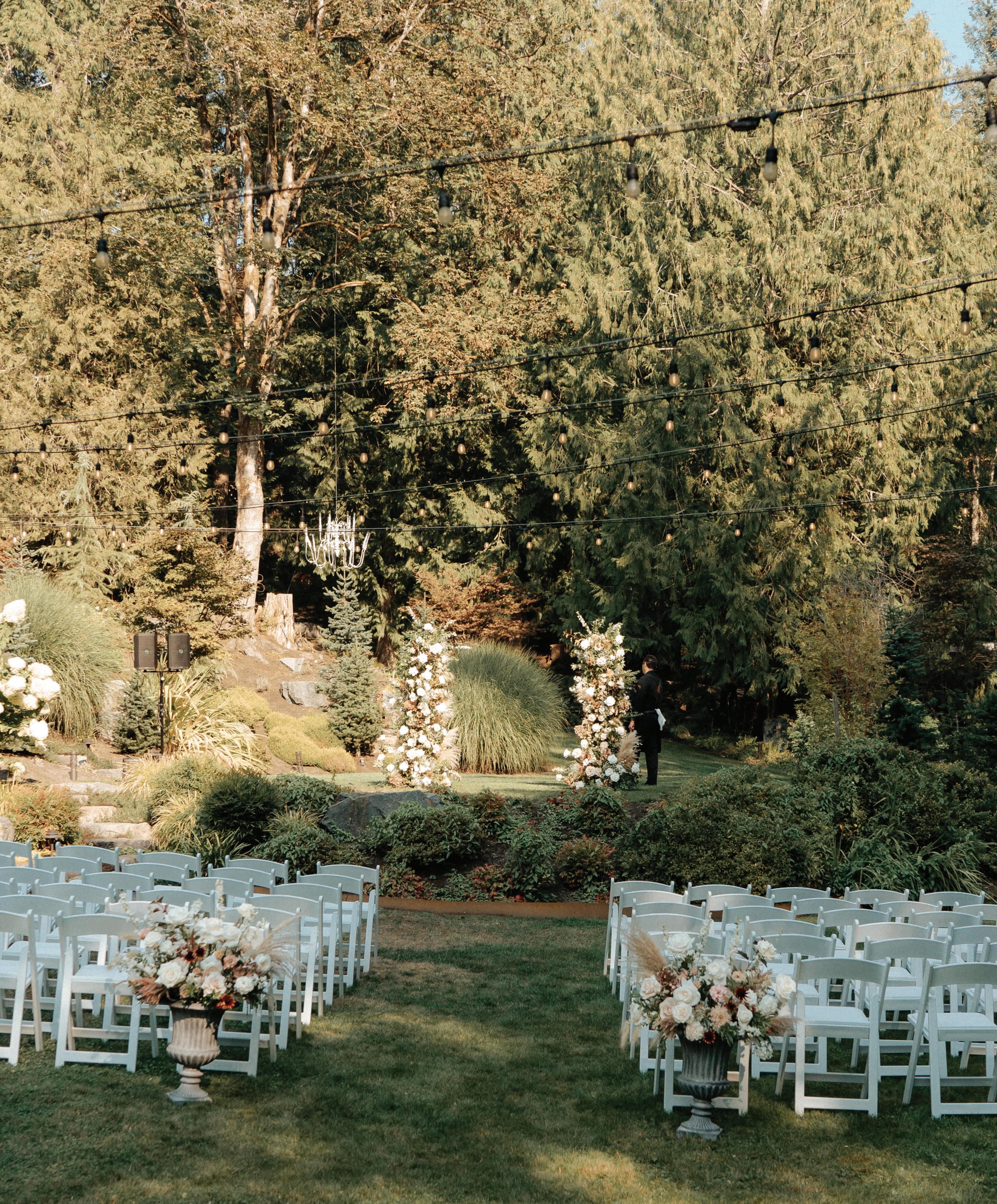 Under the glow of the late-summer sun, Jen Bashian and Cooper Hopkins married in an opulent celebration that would have made Jay Gatsby green with envy. Jen and Cooper’s love story began at a comedy class in Los Angeles, and with their shared passion for film and a flair for theatrics, it was only fitting that they incorporated elements of the golden era of Hollywood into their wedding day. Drawing inspiration from classic and timeless themes, the design for the wedding centered around a simple color palette of textured whites and greens, with elegant gold accents, perfectly complementing the rich greenery of the surrounding forest at JM Cellars. Bond in Bloom seamlessly incorporated the couple’s sources of inspiration into their wedding, crafting gorgeous floral masterpieces, such as the stunning ceremony arbor beneath which Jen and Cooper were wed. After the couple exchanged vows, the wedding party made its way to a spacious tent adorned with breathtakingly beautiful twinkling lights, reminiscent of a sparkling Pacific Northwest night. To create a sense of intimacy, guests were encouraged to gather around long, family-style tables, where they shared drinks and stories. As the festivities began, an epic disco ball illuminated the space, casting glittering disks of light on the endless dancing and bringing a touch of magic to the scene. Instead of traditional party favors, Jen and Cooper chose to make generous donations to several charities that are close to their hearts and important to their loved ones. As the night drew to a close, the two were sent off by friends and family, making a stylish exit in a sleek 1983 Pontiac limousine.