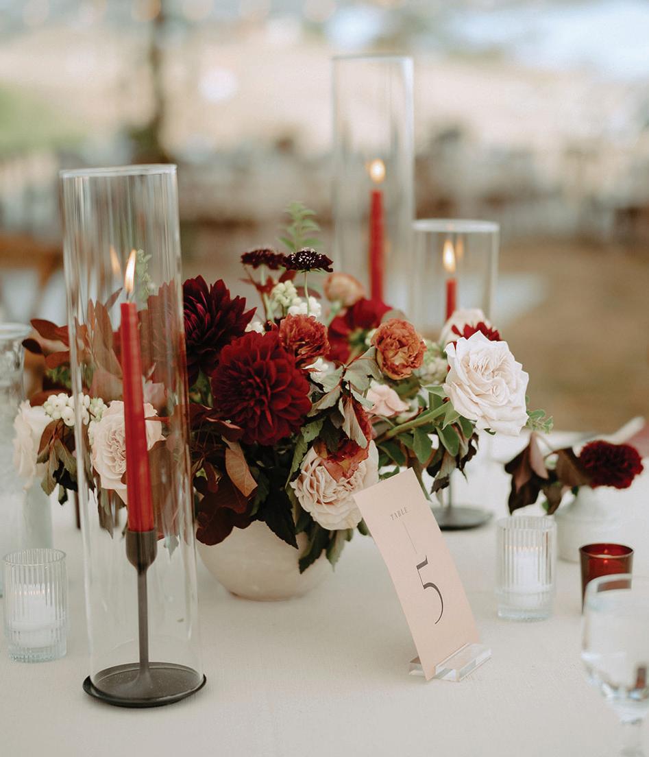 When it came to executing this flawless fall shoot at JM Cellars, a talented team of vendors went all out to create a romantic vibe with a masculine edge, mixing vintage elements with contemporary design. The moody autumnal design was anchored in a palette of burgundy, burnt orange, goldenrod and peach, with accents of teal. Luth Weddings & Events took cues from nature and the fall season, and foraged for autumn foliage to incorporate into arrangements and other design elements. Lush flowers adorned the ceremony space, floating from floor to ceiling in a sea of candles, while the sweetheart table looked as though it was risen from a field of flowers. The intimate reception table was accented with velvet teal linens, compote-style centerpieces, bud vases and glass hurricane candleholders. Other standout details of the day were the textural masterpiece of a cake, adorned with a spray of impeccable sugar flowers; a smart stationery suite with pressed leather detailing; and elegant fashion choices, including a fabulous floral lapel creation.