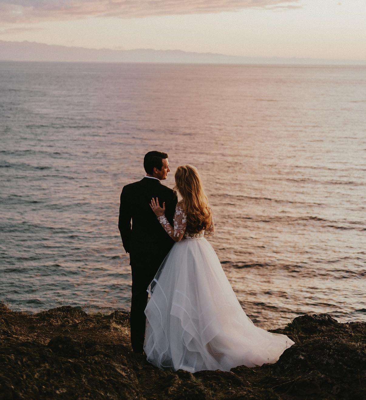“Angelina” bridal gown by Savin London, from Lovely Bride Seattle. Oval diamond halo ring with marquise diamond accents, from Green Lake Jewelry Works. Hair and makeup by I.M Artistry. Photographed by Jenn Tai & Co at Alderbrook Resort & Spa in Union. See more details on page 58.