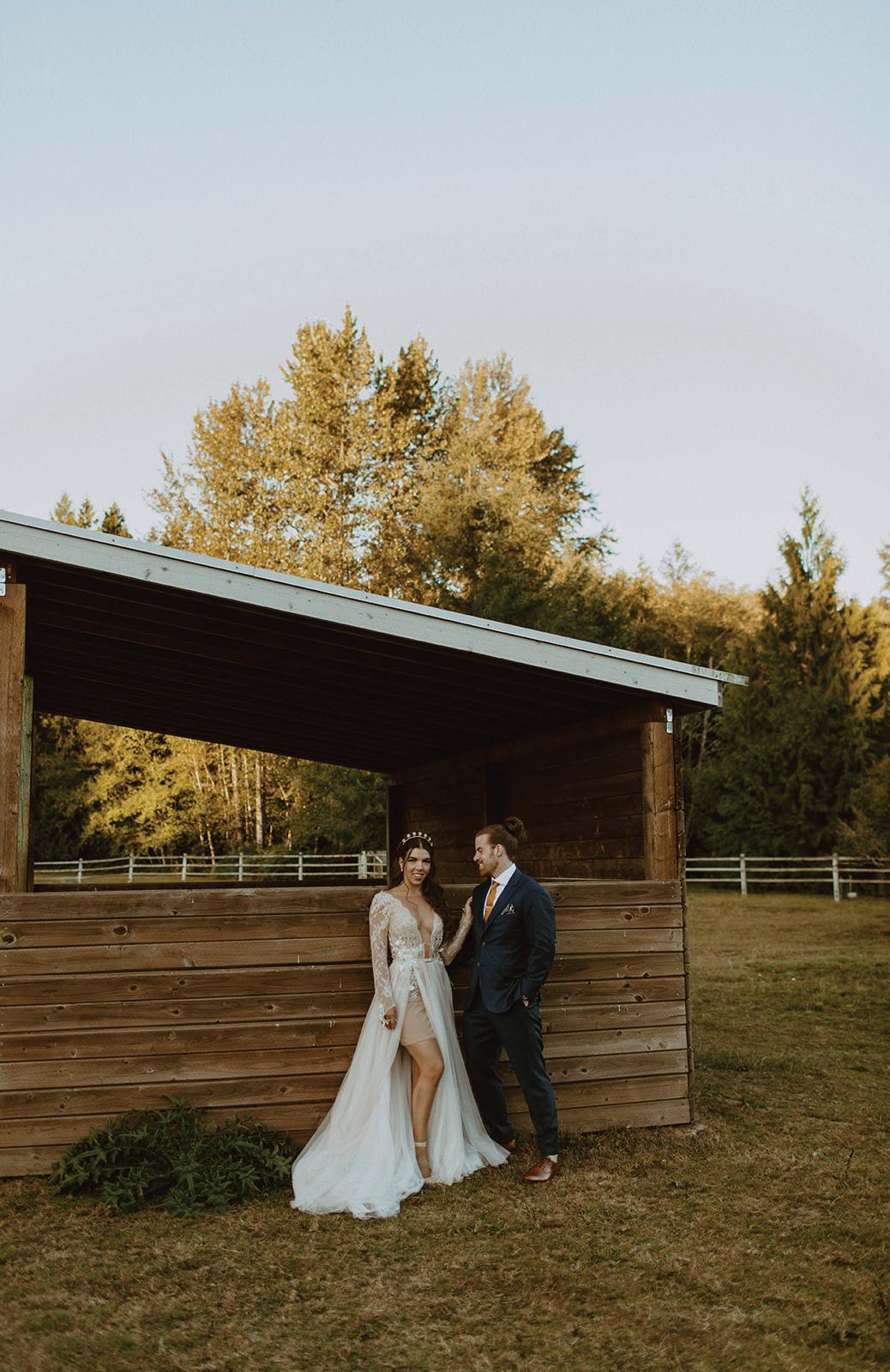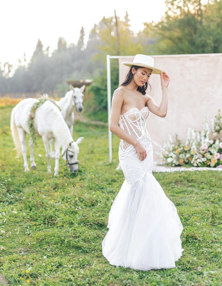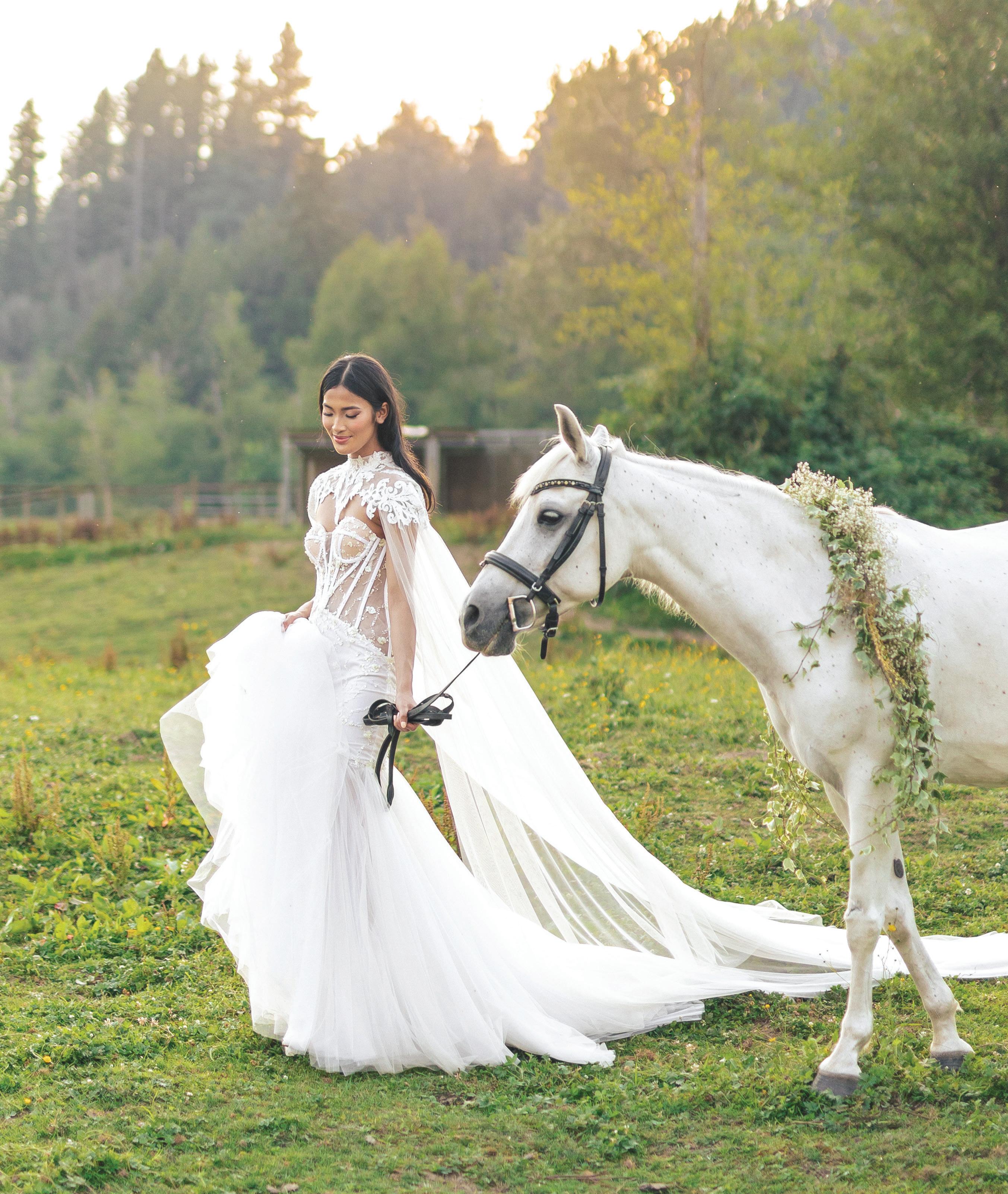 Bridal gown by Dream Dresses by P.M.N. Florals by Callarose & Co. Hair and Makeup by Kayla Kollection. Photographed by Betty Globa Photography at Juliane Henry’s Equestrian School in Snoqualmie. See more details on page 40.