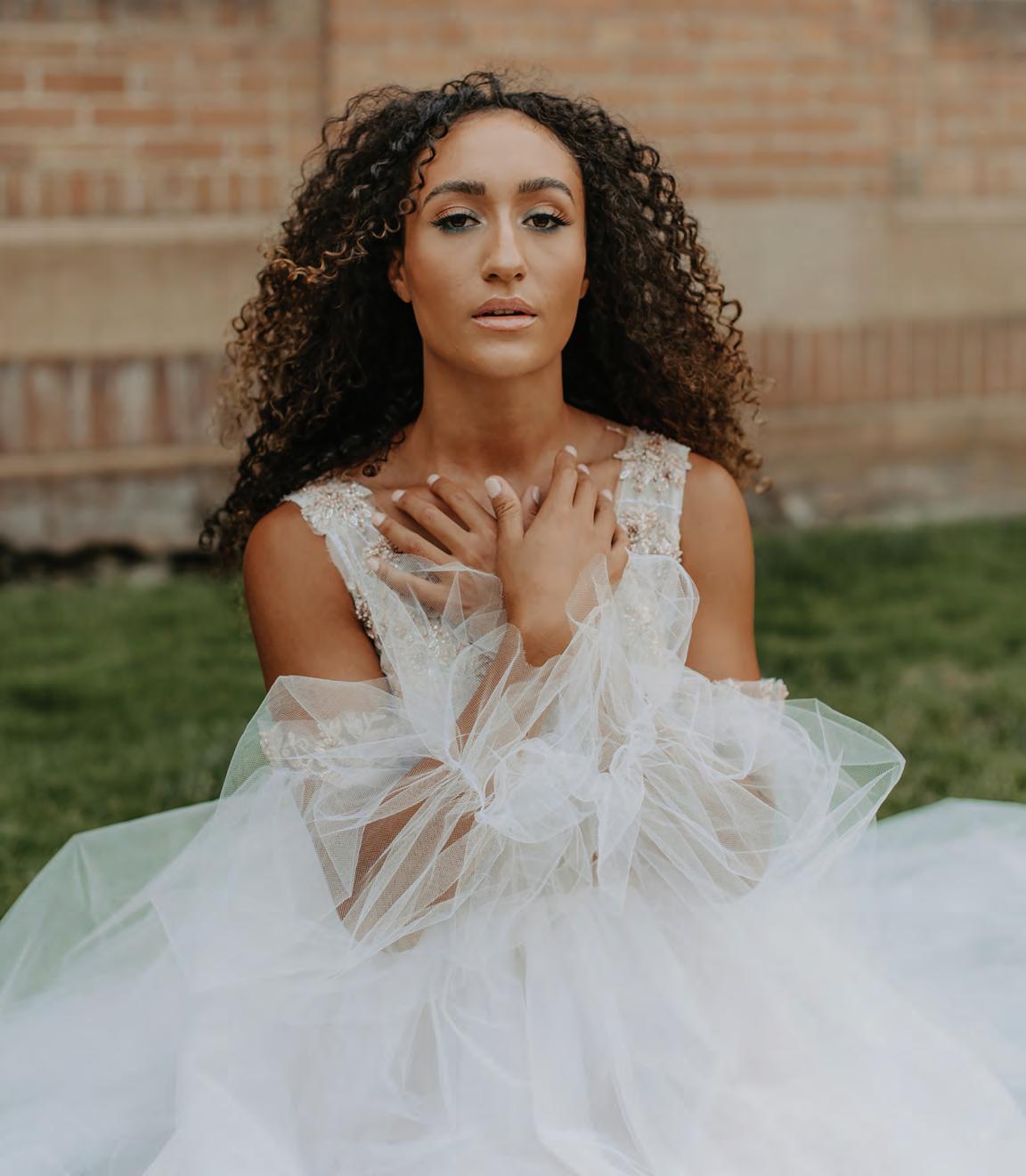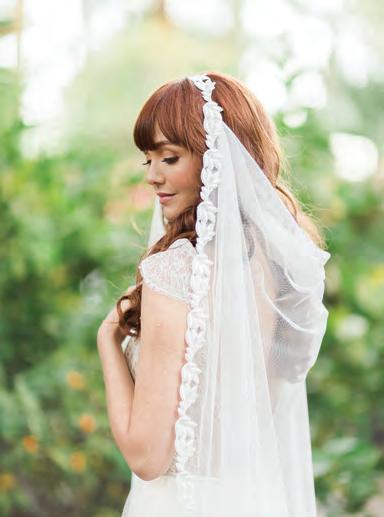 FAIRY-LIKE FLORALS Pressed silk blossoms float on English silk tulle in an elegant combination that will elevate your big-day ensemble. The “MANY PETALS” silk tulle blossom veil is also available in traditional nylon tulle. $395–$980, from Erica Elizabeth Designs, @ericaelizabethprettythingst (Photo by Stephanie Williams)