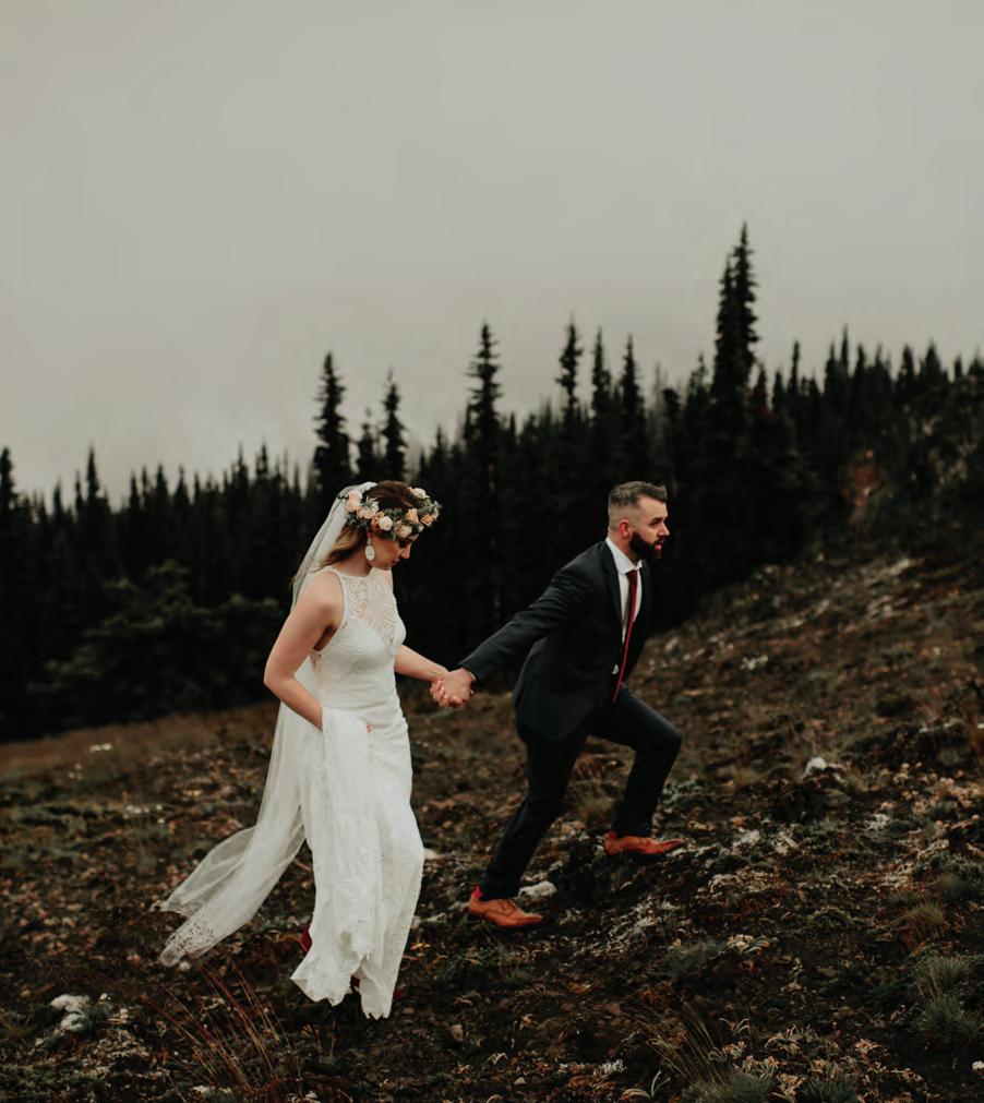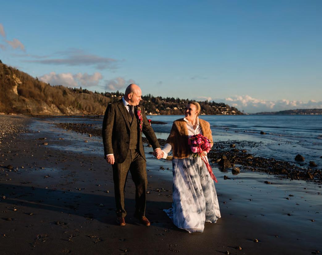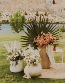 Opting for Rosario Beach as their backdrop—it was the spot where bride Michelle Barrera, the model for this shoot, came for engagement photos— photographer Chelsea Terry and florist Jessica Vann-Campbell joined forces to create an inspirational elopement shoot, contrasting the drama of a bohemian-inspired bridal style with the stunning rocky coastline. Pampas grass accents and a modern braided take on the traditional updo leave no doubt that simple details can make a bold statement. Here, the beauty of an intimate elopement takes center stage. “Elopements offer more opportunity to choose a place that’s significant to the couple and to showcase the bride in all her beauty, taking the time to capture all the little details, with no timeline to dictate the day,” reflects Terry. “Eloping is not a plan B for many couples, it’s the new plan A.”