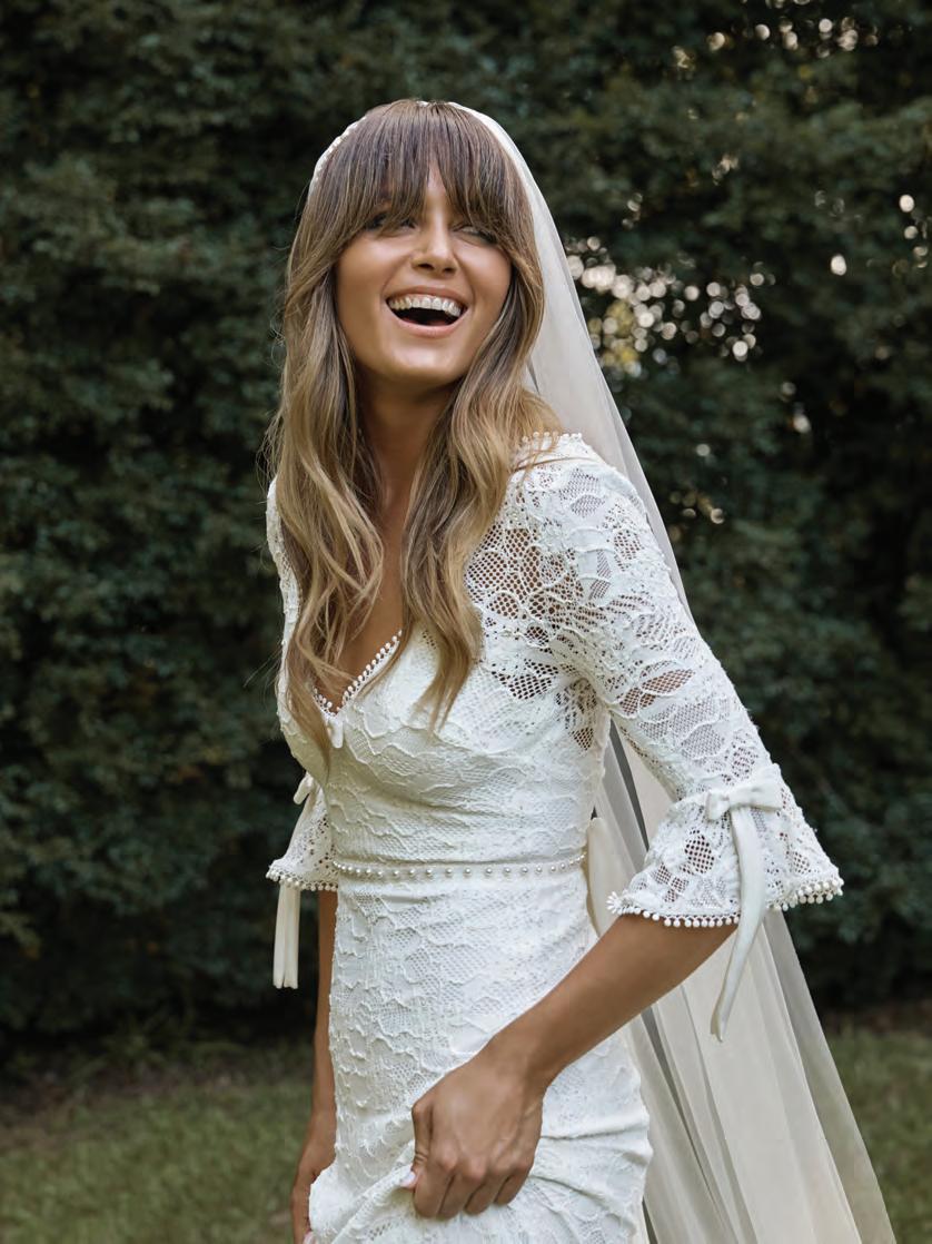 ROMANTIC BACK STORY For the bride who seeks something unique, the “LOVE STORY ” English net veil wows with its draping back and embroidered leaf trim. $250, from Lindsay Marie Design, @lindsaymariedesign