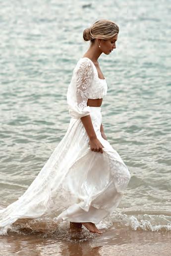 “Cecile” blouse and “Maya” skirt by Prea James, courtesy of Lovely Bride Seattle (lovelybride.com). Breezy sleeves add subtle volume and a vintage feel without being dated, as exhibited by this blouse-and-skirt combo. Balance out billowy sleeves with a sleek, curve-skimming silhouette for a neoclassical vibe.