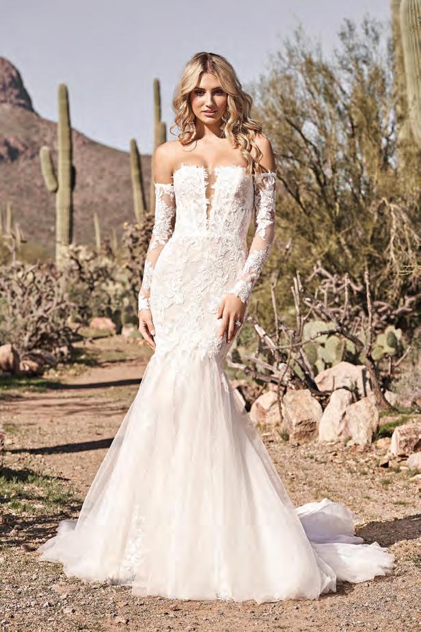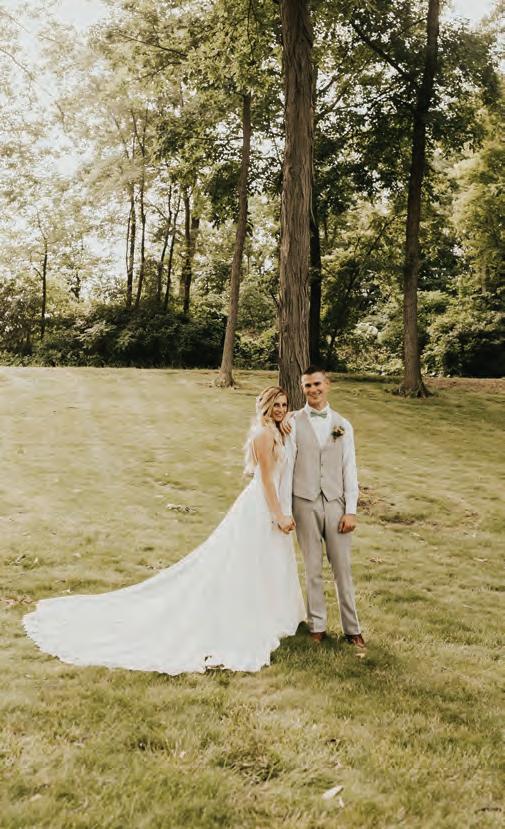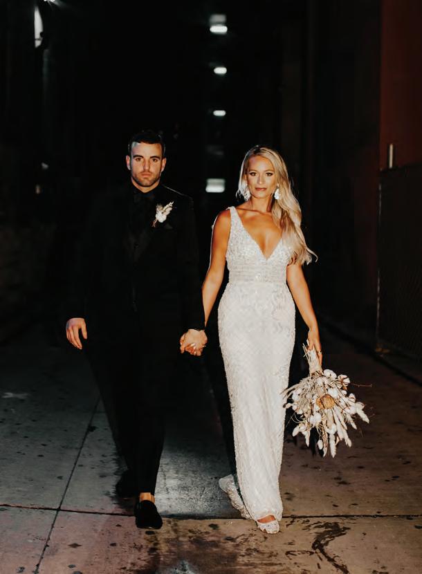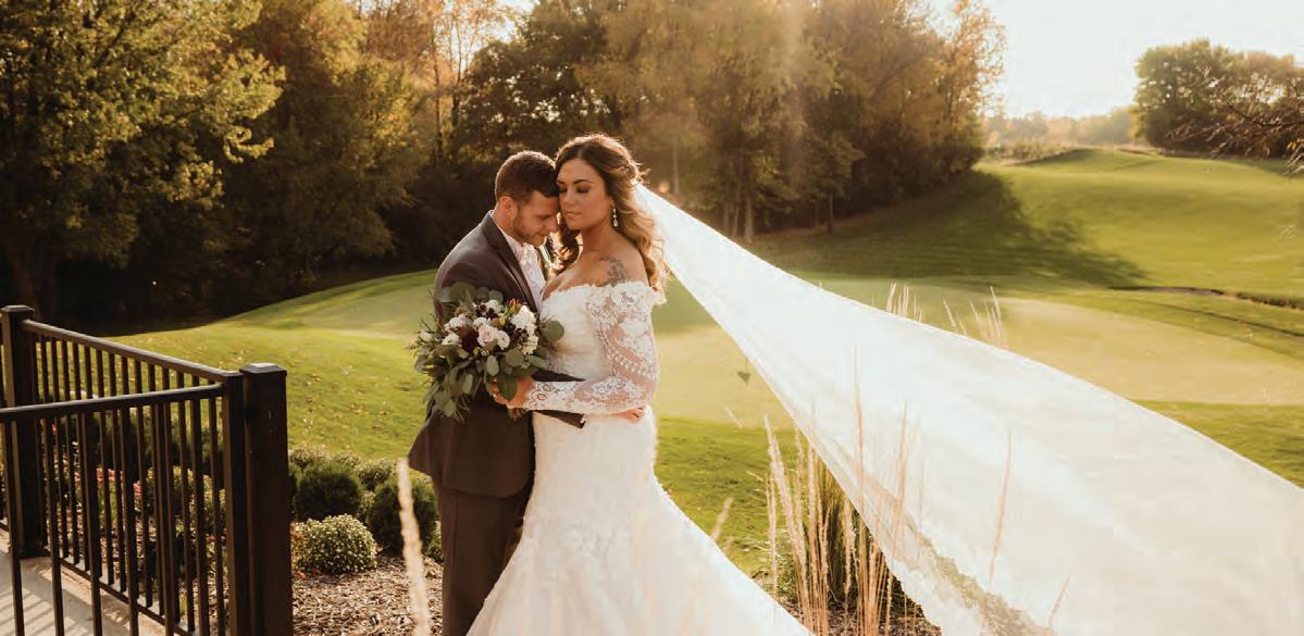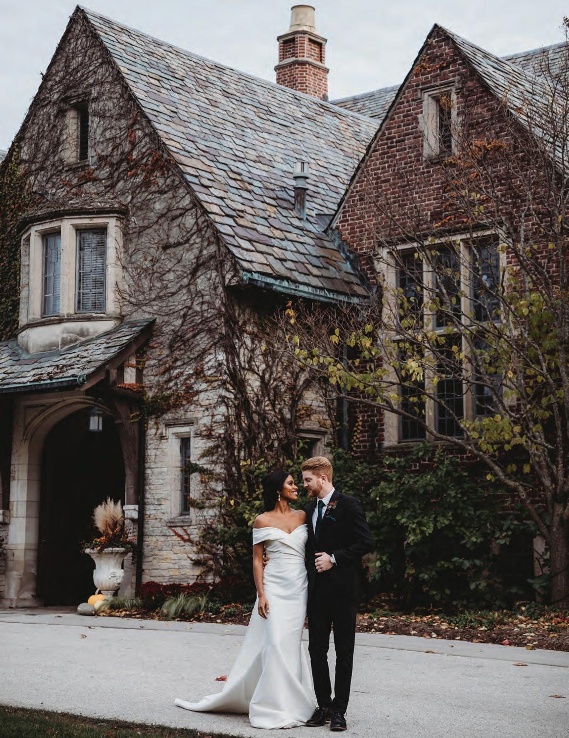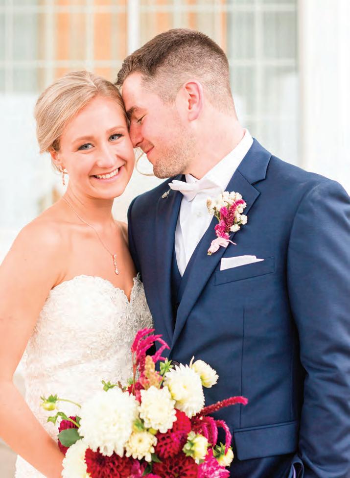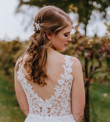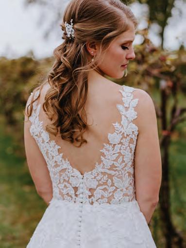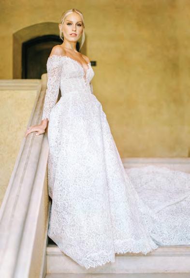 Statement sleeves are of-themoment this season, but bride Katy Schuele Scanlan took it up a notch with an all-around captivating gown for her wedding at the Kohler Riverbend Estate in Kohler. This aptly named “Lovely” ball gown by Monique Lhuillier could have been made with this bride in mind; “I knew I wanted a Monique Lhuillier dress,” says Scanlan. “I just love her aesthetic, and her dresses are so timeless and classy.” With its sculpted shape in luxurious mosaic lace and a spellbinding off-the-shoulder neckline, it’s the dress of her dreams, Scanlan says.