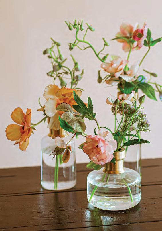 Rebecca Hawkins, owner of Bird & Bumble in Elm Grove, is pushing botanical boundaries with innovative wearable designs, such as this “floral tattoo.” This compelling creation was made for a client to wear to an intimate soirée at St. James 1868 in Milwaukee that not only commemorated her wedding anniversary with her husband, but also to celebrate her new status as a U.S. citizen. Paired with a simple off-the-shoulder silk dress, this cascading arrangement of ranunculus, hellebore, and roses is accented with hyacinth hips, clematis buds and bleached pepperberry trailing across her collarbone. It appears to stay put magically; in fact, an “invisible” combination of first aid tape and strategically placed eyelash glue keeps it in place.