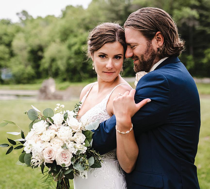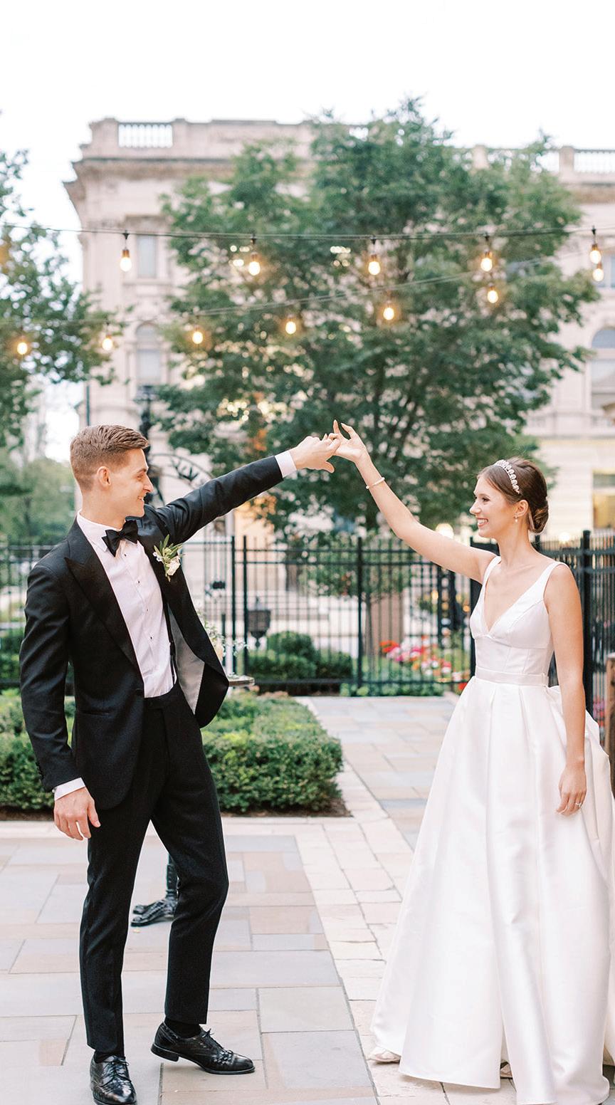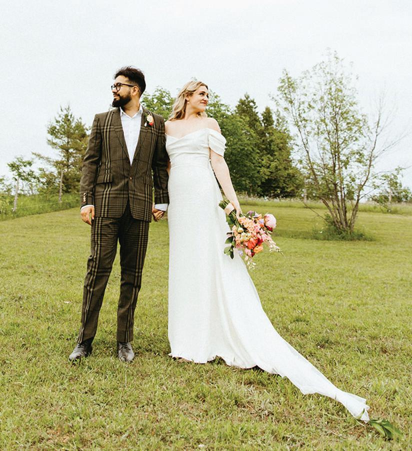 Gown: “Toussaint” by Élysée, from All About the Gown; sleeves from Hello Bride Co. Jewelry: Chinawest Jewelers. Groom’s attire: The Black Tux.