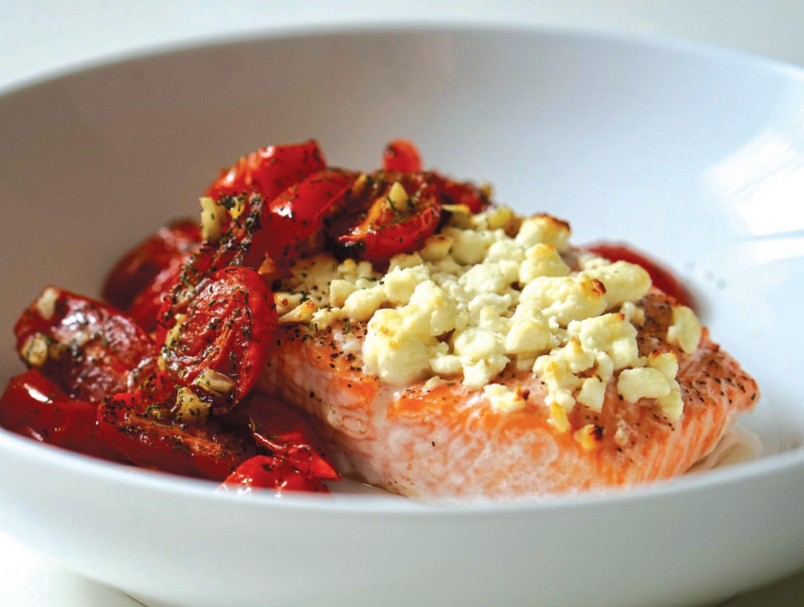 Place fish pieces, skin side down, on one side of prepared pan. Sprinkle with remaining pepper. Lightly press feta cheese on top of fish. Pour tomato mixture on other side of prepared pan. Bake, uncovered, 12-15 minutes, or until fish flakes easily with fork.
