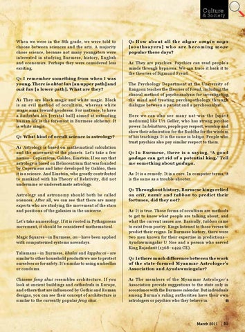 When we were in the 8th grade, we were told to choose between sciences and the arts. A majority chose science, because not many youngsters were interested in studying Burmese, history, English and economics. Perhaps they were considered less exciting. Q: I remember something from when I was young. There is ahtat lan [an upper path] and ouk lan [a lower path]. What are they? A: They are black magic and white magic. Black is an evil method of occultism, whereas white magic aims toward goodness. For instance, to have a badashin lon [crystal ball] aimed at extending human life is the foremost in Burmese alchemy. It is white magic. Q: What kind of occult science is astrology? A: Astrology is based on mathematical calculation and the movement of the planets. Let’s take a few names—Copernicus, Galileo, Einstein. If we say that astrology is based on Heliocentrism that was founded by Copernicus and later developed by Galileo, then it is a science. And Einstein, who greatly contributed to mankind with his Theory of Relativity, did not undermine or underestimate astrology. Astrology and astronomy should both be called sciences. After all, we can see that there are many experts who are studying the movement of the stars and positions of the galaxies in the universe. Let’s take numerology. If it is rooted in Pythagorean movement, it should be considered mathematical. Magic Squares—in Burmese, an—have been applied with computerized systems nowadays. Talismans—in Burmese, khalai and lapphwai—are similar to other household products we use to protect ourselves or for safety. It’s similar to using umbrellas or condoms. Chinese feng shui resembles architecture. If you look at ancient buildings and cathedrals in Europe, and others that are influenced by Gothic and Roman designs, you can see their concept of architecture is similar to the currently popular feng shui.