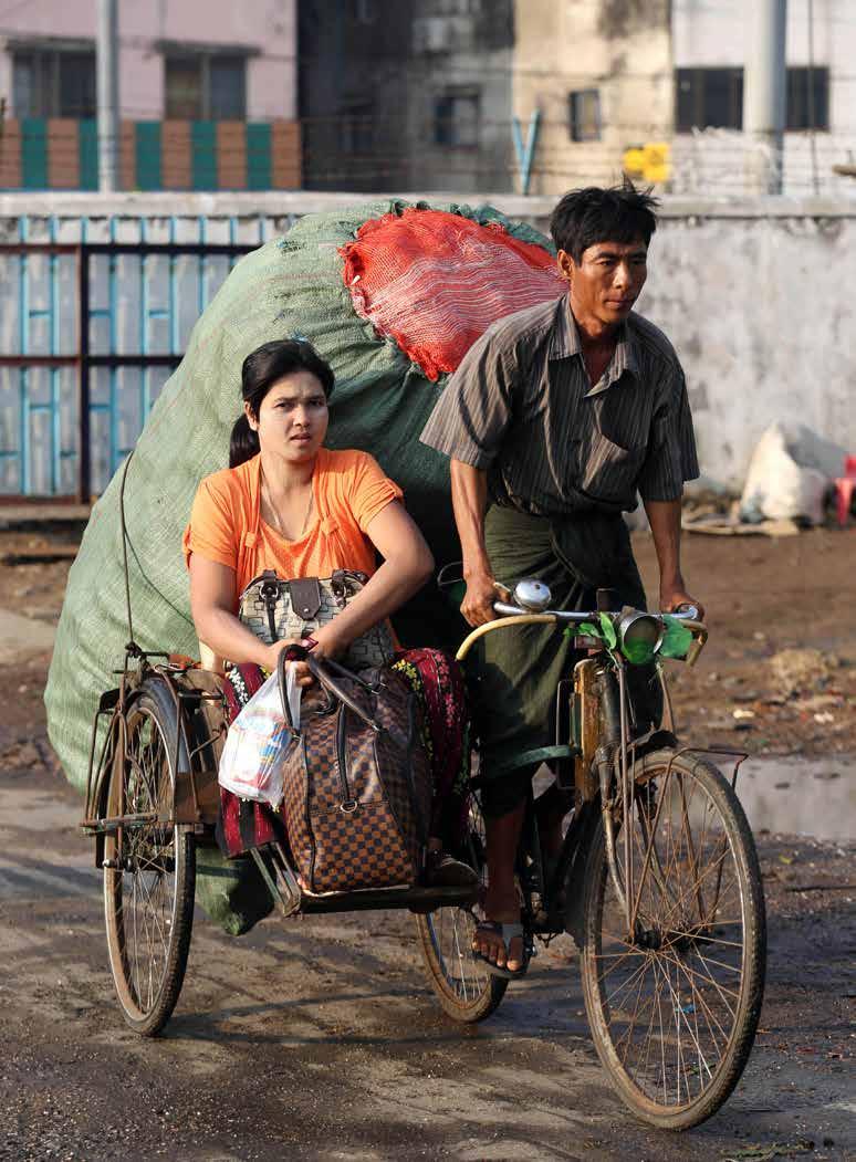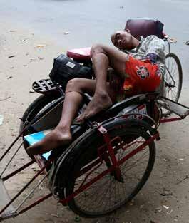 Independent business owner though he is, it’s a challenge to manage the hand-to-mouth existence. After loading three of the chunks of cement onto his rickety trishaw, Aung Naing slumps down beside the fortuneteller to rest before heading off.