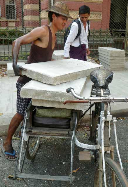 And you have to be tough. As driver Aung Naing humps huge slabs of concrete from the new pavement outside the High Court onto his trishaw, his rough hands tell a story of a life of hard physical labor.