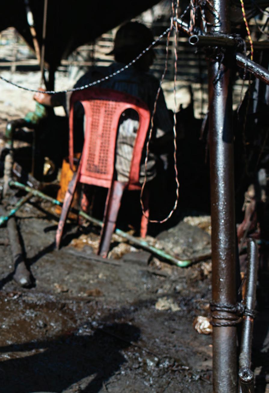 In the scorching midday heat of central Myanmar, dozens of families are hard at work. In the shade of tarpaulins and thatched-roof huts, workers operate old engine blocks and makeshift wooden drills in order to bring up that most coveted of energy sources: oil. The workers and their children collect the sticky crude oil in order to sell it to local refineries that use it to produce petrol and diesel. For some 250 impoverished families at Bandua Pen village in Thayet Township, Magway Region, a hilly site located on the banks of the Ayeyarwady River, this dirty, backbreaking work is a key source of income.