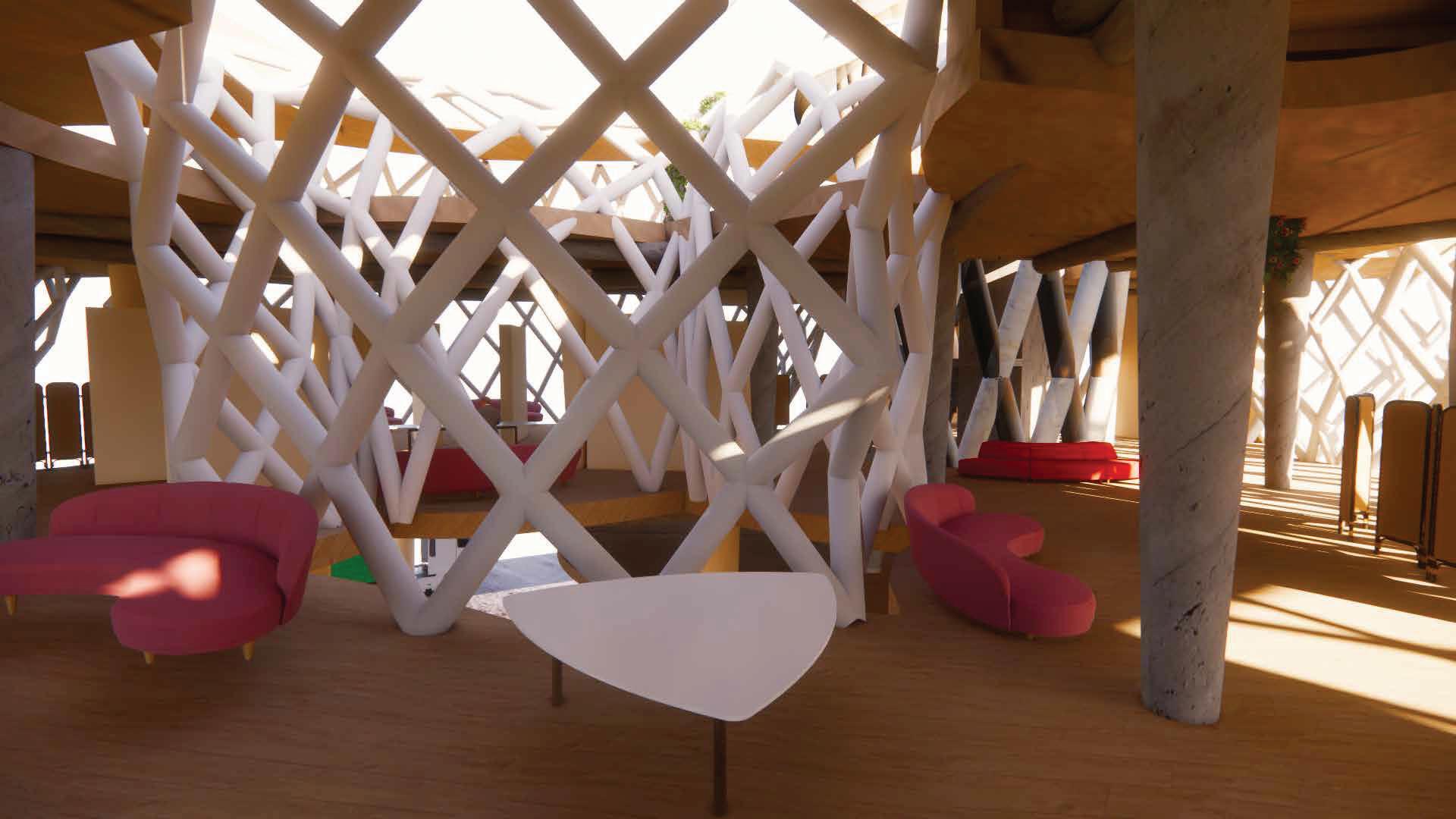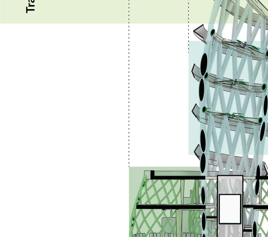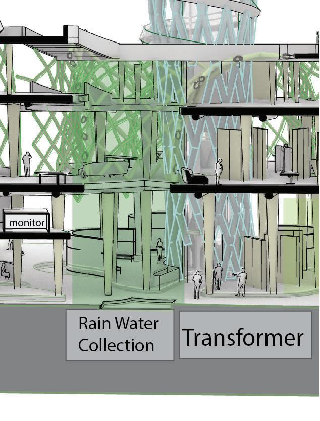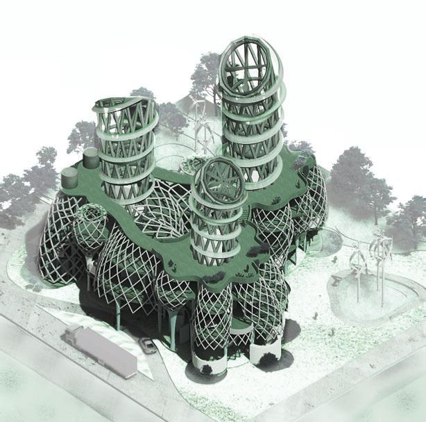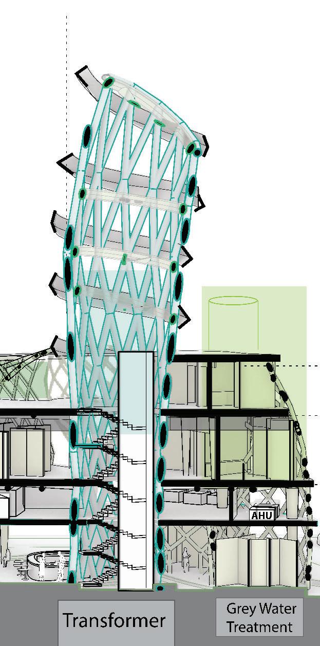 Located adjacent to the Marine Barrage, the glass-sponge inspired Wind Energy Research Center harvests the momentous wind velocity near the coast to generate electricity. Three prominent turbine generators first grow organically from the terrain, synthesizing both the seasonal monsoon pattern and surrounding vegetations. While the lower levels are reserved for functional and servant spaces, the upper levels would be organically subdivided into working and studying pods for visitors and researchers to inhabit. The promenade experience then culimnates into a wind garden of the roof.