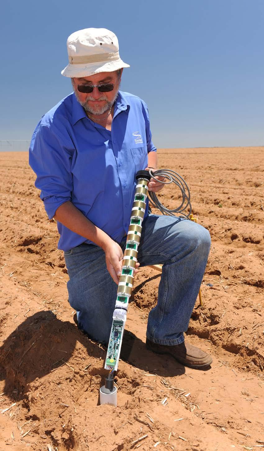 Capacitance sensors measure the water content of a soil using the time or frequency of a pulse travelling between or returning to electrodes. Photo credit: Sentek Technologies.