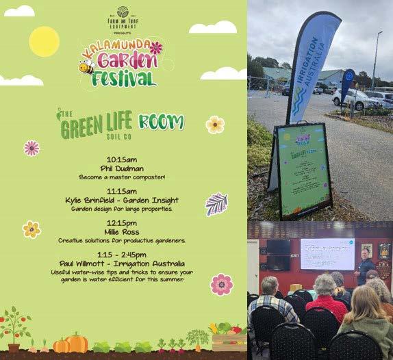 Irrigation Australia presented a Waterwise Garden Workshop at the Kalamunda Garden Festival on 3rd September 2023, to assist enthusiastic gardeners learn about lawn care, lawn alternatives, efficient irrigation, smart irrigation controllers, soil improvements and mulches. Whilst the weather was extreme (gale force winds, rain and a predicted hail storm) the crowds were out in force, many bringing “Dad” along for the ride as it was Father’s Day. A multitude of stalls were displaying arts and craft items for sale, plants, honey, vegie and herb growing options and garden statues of all descriptions. Many attendees were enjoying the variety of live bands playing music while enjoying a variety of food truck delicacies.