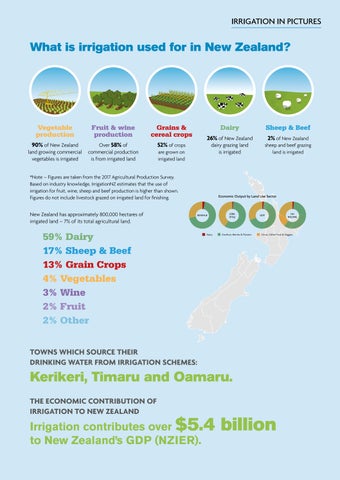 49|SPRING 2020 IRRIGATION NZ NEWS productionVegetable 90% of New Zealand land growing commercial vegetables is irrigated *Note – Figures are taken from the 2017 Agricultural Production Survey. Based on industry knowledge, IrrigationNZ estimates that the use of irrigation for fruit, wine, sheep Figures do not include livestock Citrus, Other Fruit & VeggiesDairy Kiwifruit, Berries & Flowers Economic Output by Land Use Sector New Zealand has approximately 800,000 hectares of irrigated land – 7% of its total agricultural land. 59% Dairy 17% Sheep & Beef 13% Grain Crops 4% Vegetables 3% Wine 2% Fruit 2% Other TOWNS WHICH SOURCE THEIR DRINKING WATER FROM IRRIGATION SCHEMES: Kerikeri, Timaru and Oamaru. What is irrigation used for in New Zealand? THE ECONOMIC CONTRIBUTION OF IRRIGATION TO NEW ZEALAND Irrigation contributes over $5.4 billion to New Zealand’s GDP (NZIER).