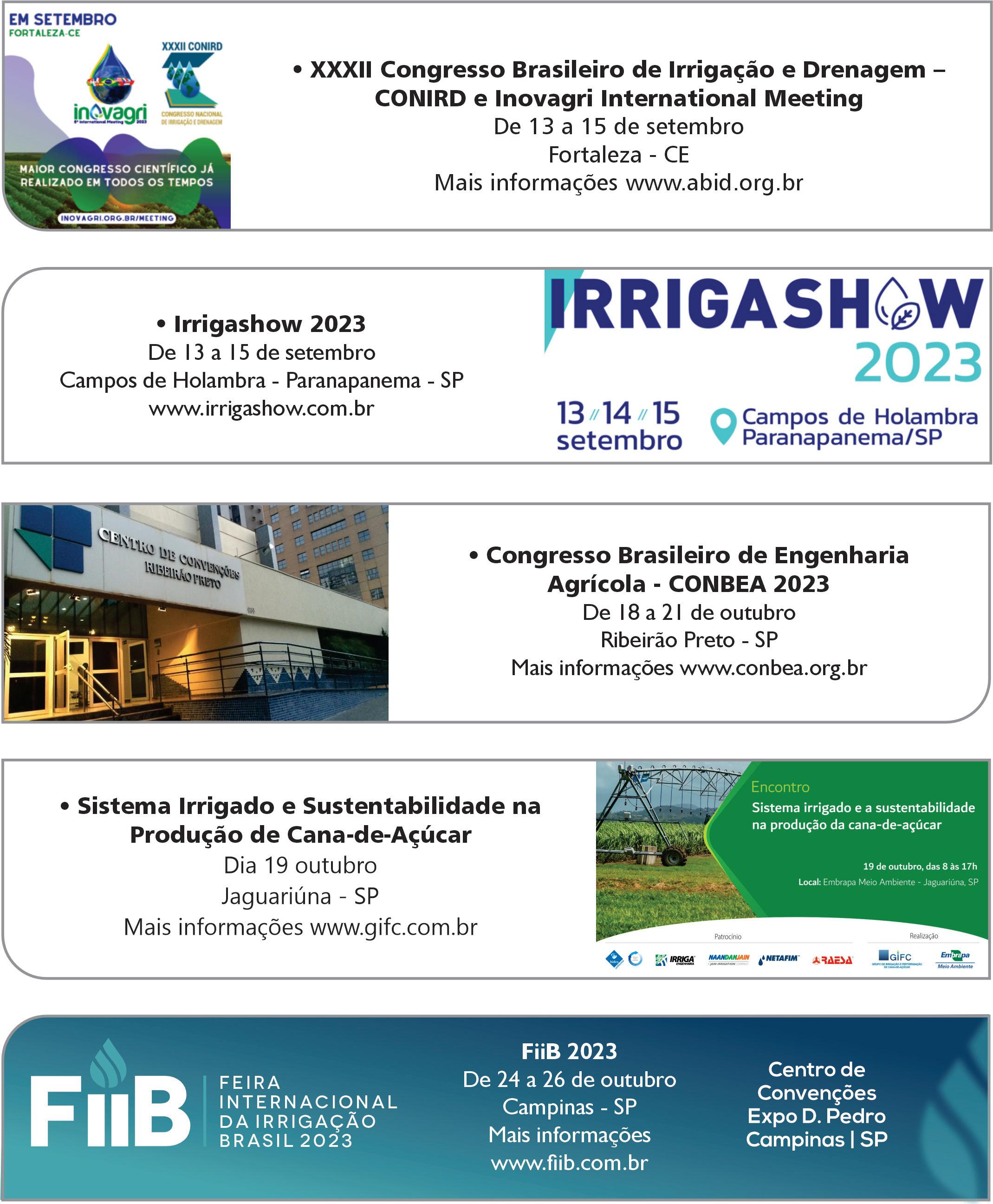 O Grupo de Irrigação e Fertirrigação de Cana-de-açúcar (GIFC), em parceria com a Embrapa Meio Ambiente, realiza em 19 de outubro de 2023 em Jaguariúna, SP, o Encontro “Sistema Irrigado e a Sustentabilidade na Produção da Canade-Açúcar”. As vagas são limitadas e as inscrições vão até 31 de agosto (1º lote) e a partir de 1º de setembro começam as vendas do 2º lote. De acordo com os organizadores, o evento será um encontro técnico pioneiro e de alto nível para debater as conquistas, inovações, desafios e oportunidades de aprimoramento da eficiência ambiental das usinas por meio da inserção do sistema irrigado em uma fração de suas áreas.