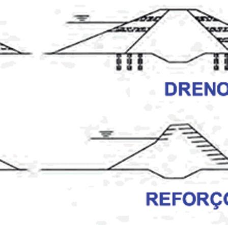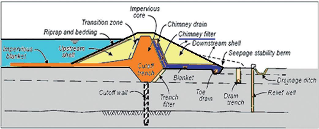 A Figura abaixo mostra os principais dispositivos usados no maciço da barragem de terra para protegê-lo: