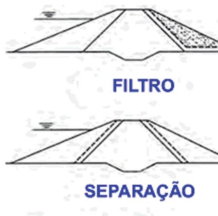 Os principais tipos de filtros usados em barragens de terra são mostrados na Figura abaixo: o vertical (ou chaminé), horizontal e de pé (cor azul forte).