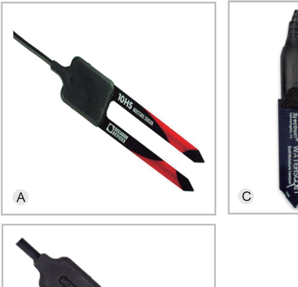 Por exemplo a água possui uma permissividade em torno de (80) enquanto o solo fica em torno de (3 a 5) ou ar (1), por isso a permissividade é controlada pelo conteúdo de água no solo, possibilitando a determinação do conteúdo volumétrico de água no solo com precisão em outras palavras um solo com maior conteúdo de água vai ter uma leitura mais rápida e valores menores no equipamento. Outra vantagem desta técnica se deve ao fato de prever com precisão os teores de água em diferentes tipos de solos minerais, variando desde solos arenosos até com alto teor de argila. Existem vários tipos de sensores de TDR no mercado como o 10HS Soil Moisture Sensor® e o Decagon Echo® EC-5 da Decagon Services e o Spectrum SM100 Waterscout® da Spectrum® Technologies, Inc. como mostrado na (Figura 3 ).