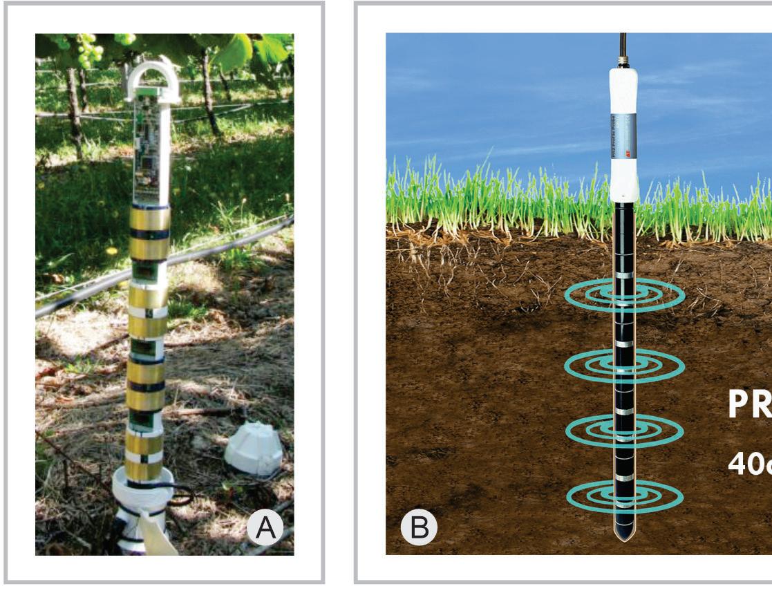 serem realizadas no tempo e sim através de alternância de frequência eletromagnética. Esta característica faz com que o equipamento seja mais simples e barato entre os sensores que se destacam utilizando essa tecnologia/técnica temos a Multisonda Enviroscan® (Sentek) com duas sondas perfilhadoras (PR2/4 e PR2/6, variando apenas a profundidade Delta T Devices (www.delta-t.co.uk) (Figura 4). Existem também os Sensores de Matriz Granular (GMS) que consiste em um par de eletrodos embutidos em um bloco de gesso. O funcionamento consiste no movimento da água entre o solo e o sensor se manifesta em variações da resistência elétrica entre os eletrodos do dispositivo, onde essas variações resistência elétrica é convertida em potencial mátrico do solo. Um dos sensores mais conhecidos que se utilizam dessa técnica é o sensor Watermark® 200 (IRROMETER COMPANY Inc)