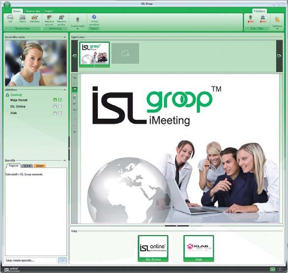 ISL Groop, trenutno še beta različica, uporabniku omogoča učinkovito komunikacijo s poslovnimi partnerji, sodelavci ali učenci. Po spletnem vmesniku se v nekaj minutah vzpostavi spletni sestanek, pri čemer program ne zahteva nobenih posebnih nastavitev in namestitev. Potrebna je le povezava z internetom, za aktivno sodelovanje v videokonferenci pa potrebujemo še slušalke z mikrofonom in spletno kamero. V virtualno sejno sobo se lahko uvozi predstavitev v PowerPointu ali pa udeleženci delijo svoje namizje in v živo prikazujejo vsebino na zaslonu. Med predstavitvijo se lahko uporabljajo tudi orodja za opombe, s katerimi se poudari najpomembnejše točke predstavitve.
