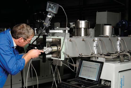 Še pred kratkim je bilo treba pri daljših zastojih za ugotavljanje obrabe cilindrov ekstrudorja razstaviti celoten stroj, danes pa je za to potrebnih komaj nekaj ur. Senzorji izmerijo dejanski premer obeh izvrtin po celotni dolžini ekstrudorja na vsakih 5 mm in v treh različnih položajih po obodu. Programska oprema za analizo nato na podlagi teh meritev ovrednoti obrabo. Za natančnejšo analizo površine materiala je merilna glava opremljena z endoskopsko kamero, ki zagotavlja kakovostno sliko notranje površine.