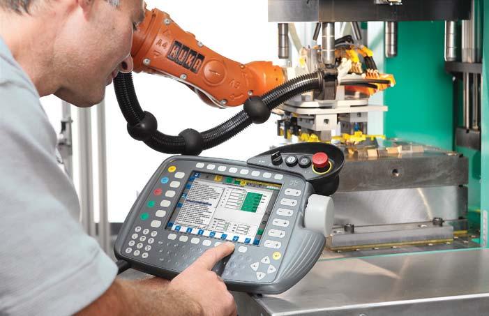 jednostavno programiranje robota funkcijom “TEACH IN”. S pomoću te je funkcije moguće jednostavno “naučiti” robota kako se i gdje treba gibati te koje dodatne funkcije treba izvesti (odlaganje, razdvajanje dobrih i loših otpresaka...). Prikazana je bila i integracija 6osnog robota u zajednički upravljački sustav, što se već primjenjuje u praksi.