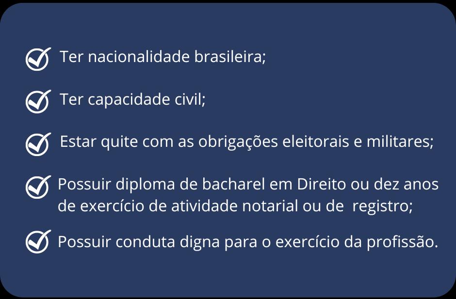 De acordo com o texto constitucional, a pessoa que deseja ocupar uma serventia extrajudicial deve ser aprovada em concurso público de provas e títulos. Os concursos são realizados pelo Poder Judiciário dos estados e do Distrito Federal, que também devem verificar alguns requisitos.