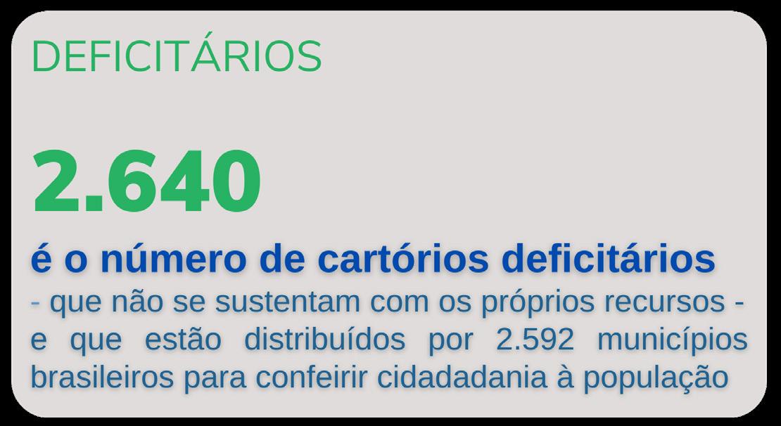 De acordo com pesquisa realizada pela ANOREG/BR (Cartórios em Números – 4ª edição – 2022), existem 2.640 cartórios deficitários no país. Os cartórios estão presentes em todos os municípios brasileiros, e as realidades são discrepantes.