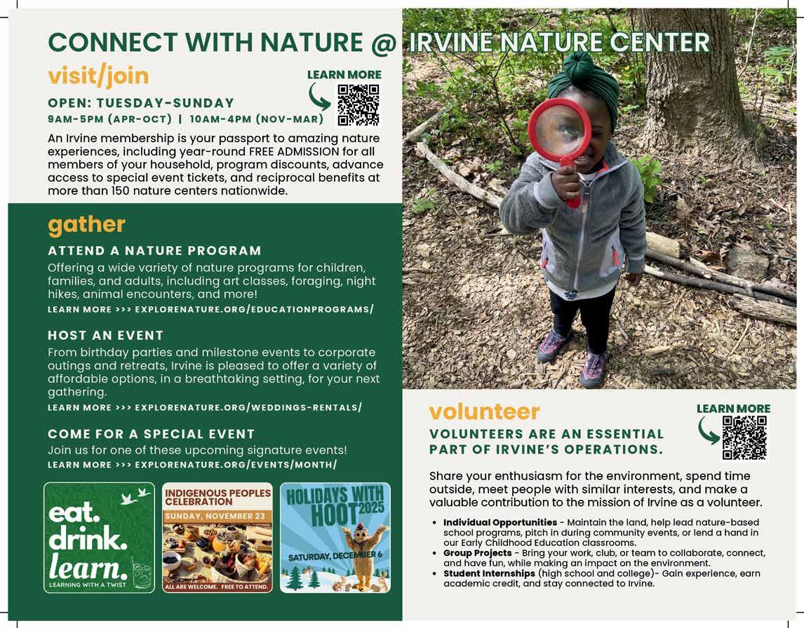 We are thrilled to have you here tonight for the 17th Annual Pumpkins on the Green, benefiting Irvine Nature Center as it celebrates 50 years of environmental education and community awareness! Your financial support is what keeps Irvine going strong, helping to educate and inspire people of all ages to explore, respect, and protect nature.